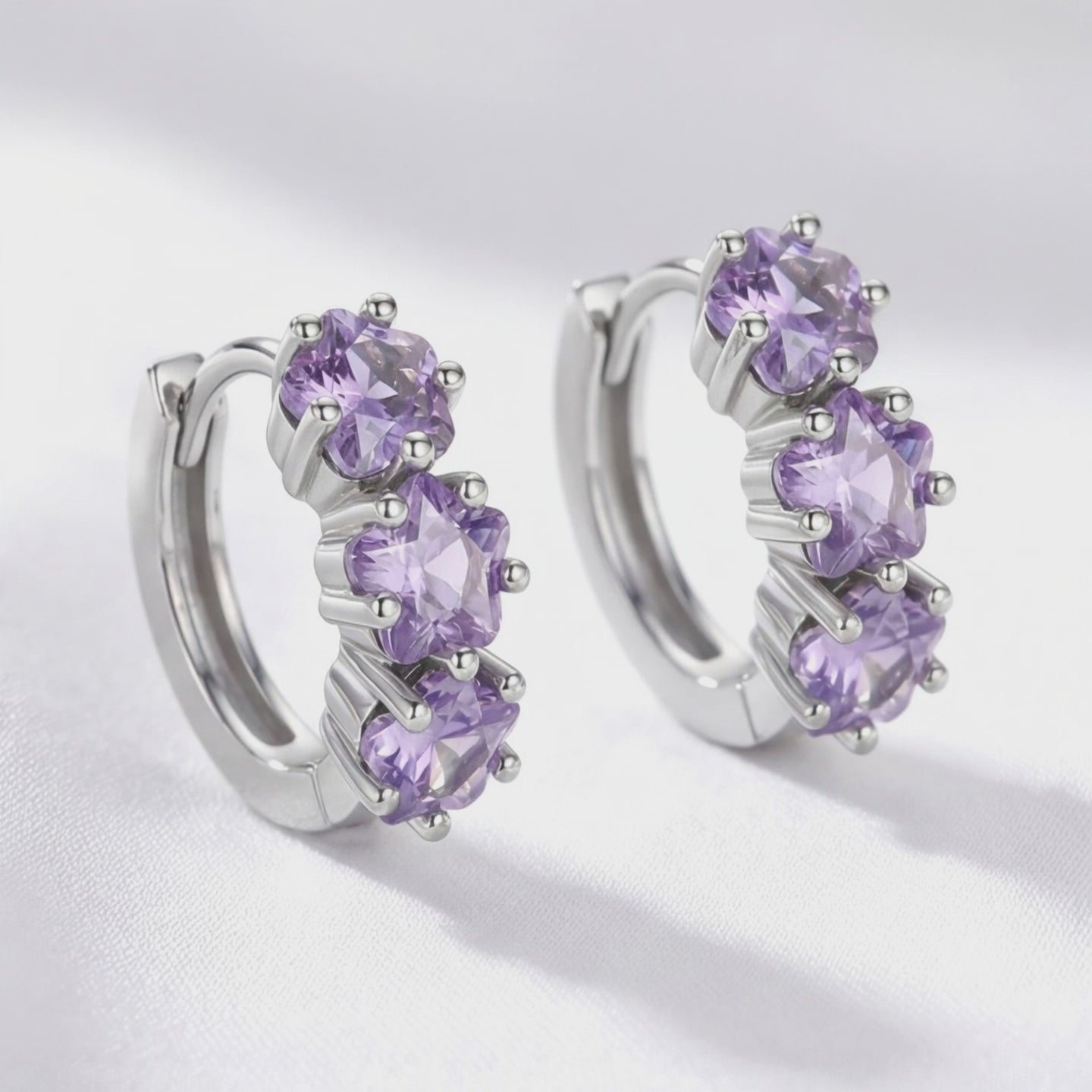 Front view of S925 sterling silver huggie earrings featuring triple star-cut purple simulated amethysts.