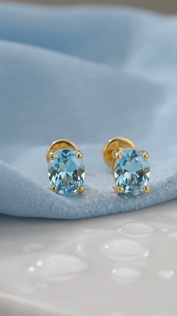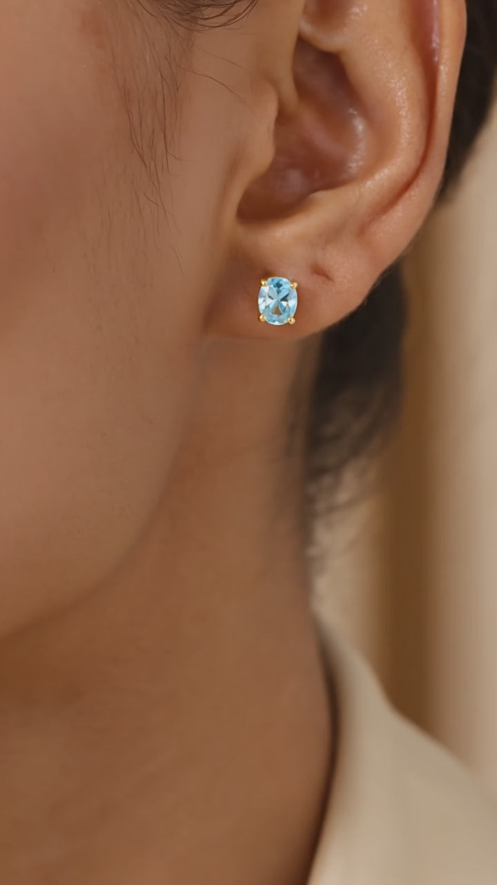 Woman wearing an oval cut simulated aquamarine stud earring in 18K gold vermeil.