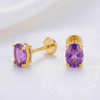 Pair of oval-cut simulated amethyst stud earrings in 18K gold vermeil shown on white fabric.