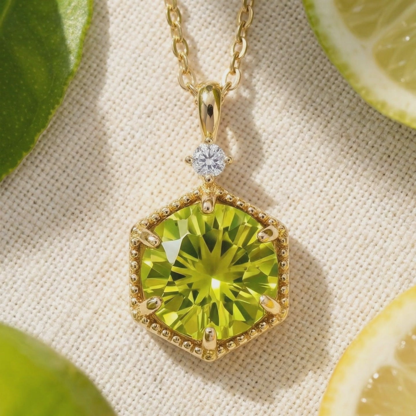 Side view of the Belenis Hex necklace in 18K gold vermeil showing the detailed setting and simulated peridot stone.