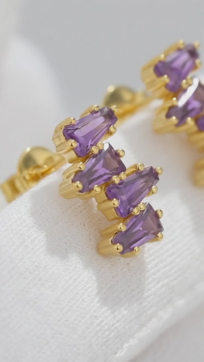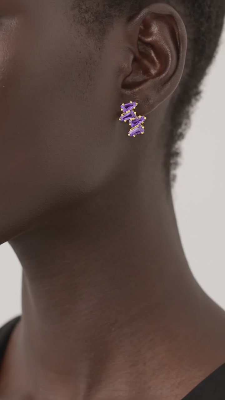 Model wearing the Callista cluster stud earring in 18K gold vermeil with purple simulated amethyst stones.