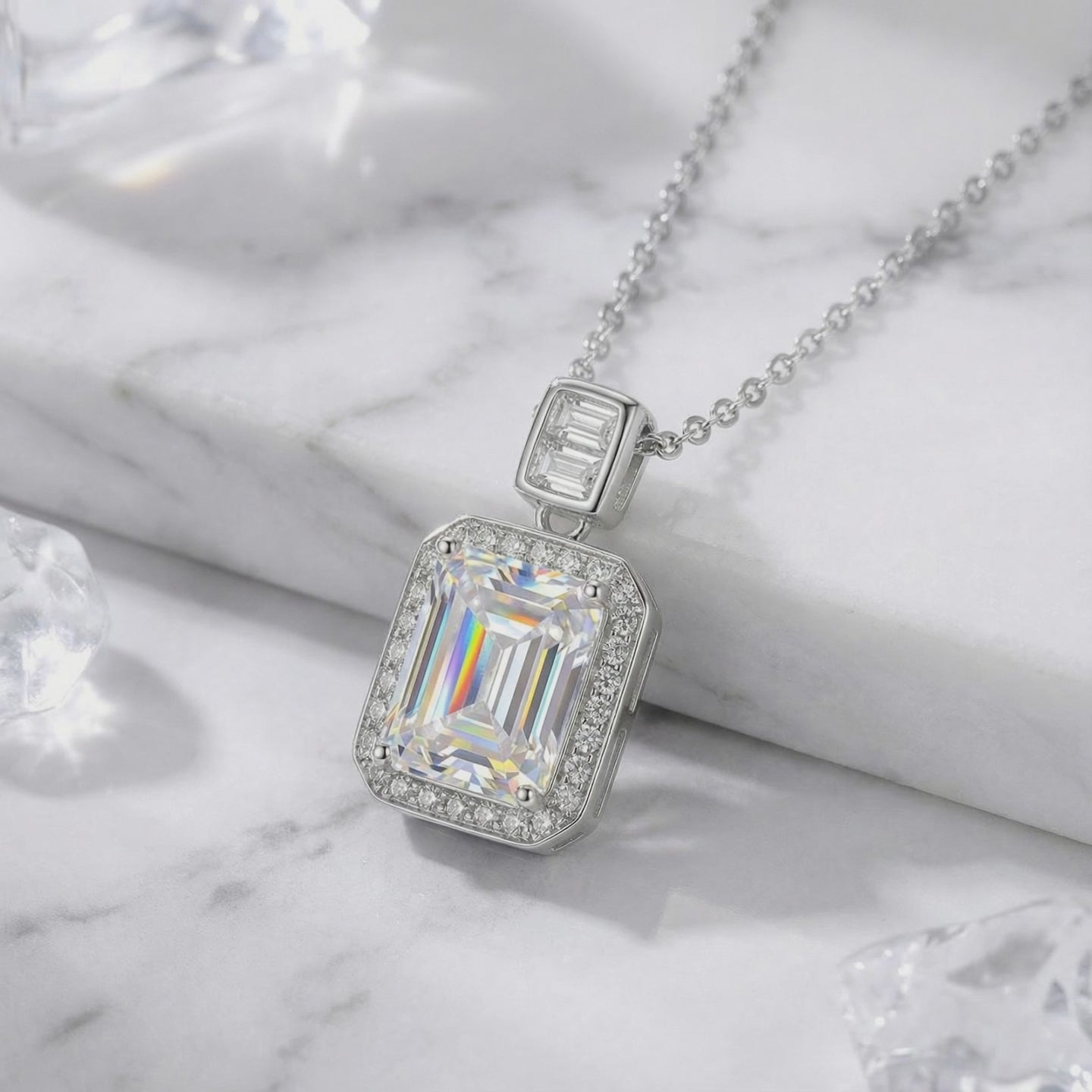 - Stone: Emerald cut moissanite gemstone