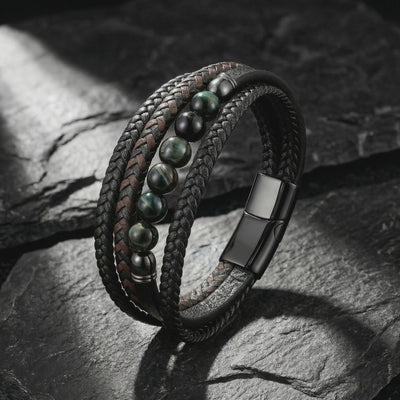 Men's jewelry shouldn't require constant maintenance. The Centurion Bracelet is engineered from premium braided black leather and Swiss Watchmaker Grade 316L stainless steel. We built this multi-layered piece to stack perfectly with your favorite watches or stand confidently on its own.