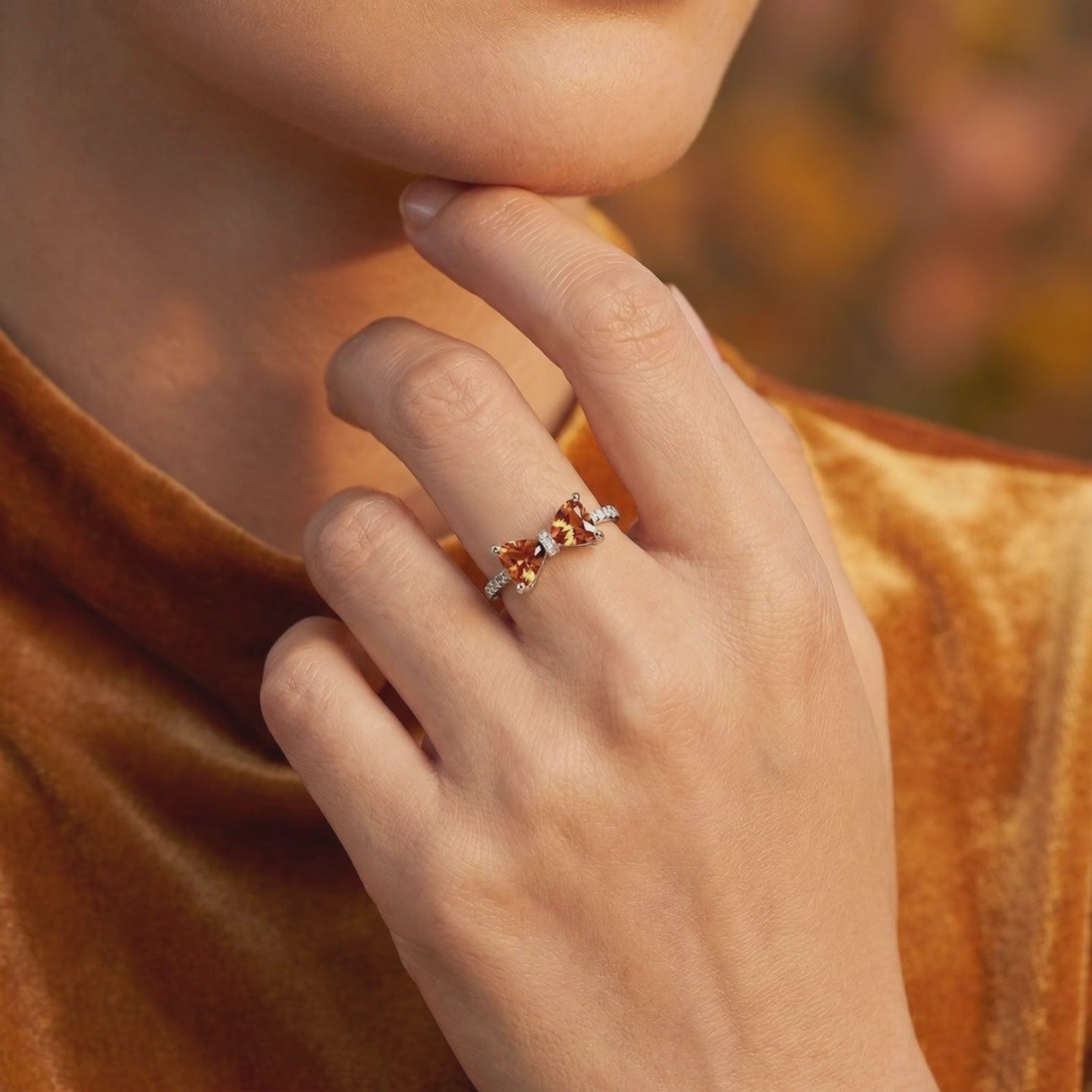 The bow-inspired bypass setting is crafted from Solid 925 Sterling Silver and finished with a protective layer of Rhodium. This ensures a tarnish-resistant, platinum-like shine that stands up to daily wear and hand sanitizer. The open, adjustable design provides a custom fit while maintaining a low-profile silhouette that won't snag on fine knits.