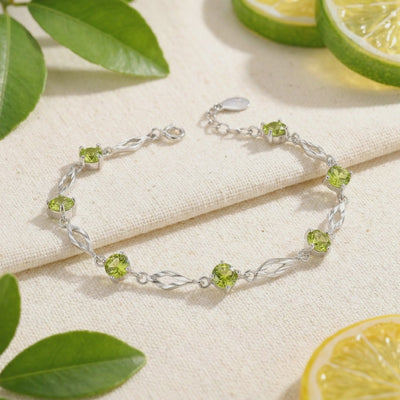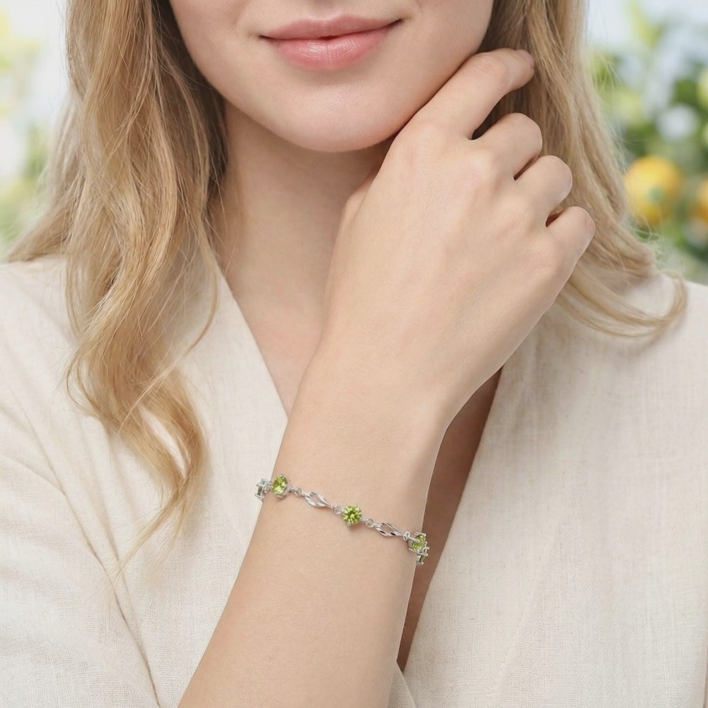Close-up of round-cut simulated peridot stones in a prong-set S925 sterling silver station bracelet.