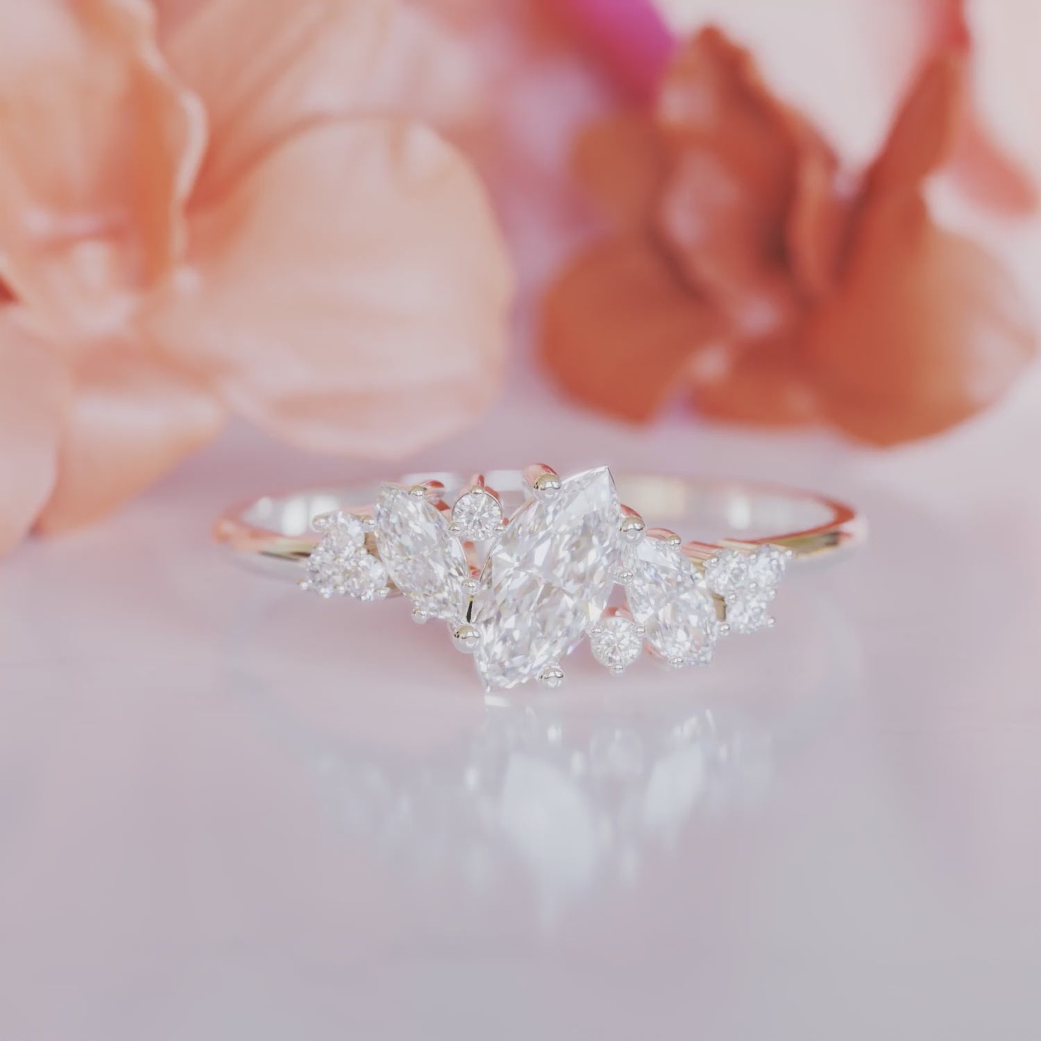 Découvrez "The Cluster", où l'élégance intemporelle rencontre le design moderne. Cette bague captivante présente un sertissage en grappe avec de superbes moissanites taille marquise, créant un look sophistiqué et radieux. La pierre centrale idéale taille marquise, classée D en couleur et FL/IF en clarté, offre un éclat inégalé pour un effet éblouissant qui laissera une impression durable.