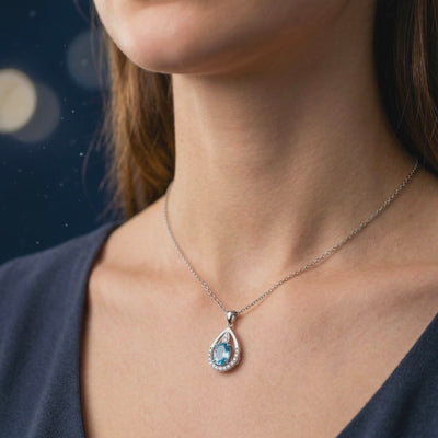 You don't need an occasion to wear an extraordinary masterpiece; you just need the right stone. The Coriana Necklace features a substantial 7x9mm certified natural blue topaz, expertly faceted in a classic oval cut. Because natural topaz possesses exceptional, eye-clean transparency, our lapidaries utilize this precision cut to allow light to travel deeply into the stone, refracting a vivid, electric hue that commands attention from across the room. Framed by a delicate halo of brilliant A5 cubic zirconia accents, this pendant captures and amplifies every beam of light.