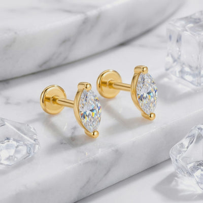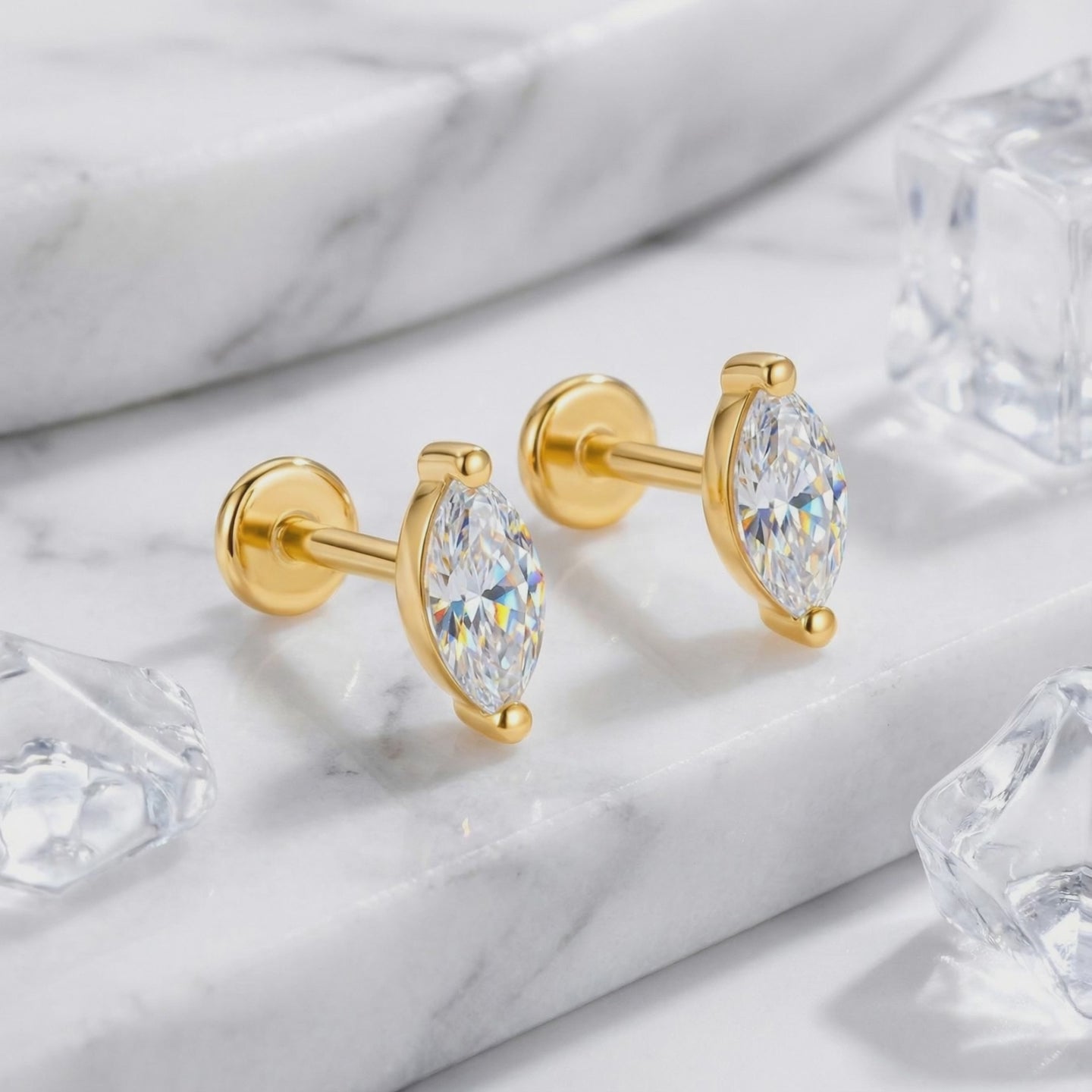 Front view of marquise-cut simulated diamond stud earrings in 18K gold vermeil on a marble background.