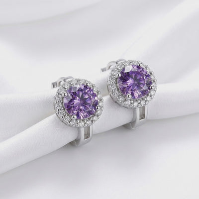 Close-up view of a purple moissanite halo stud earring in sterling silver on a woman's ear.
