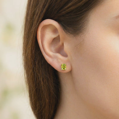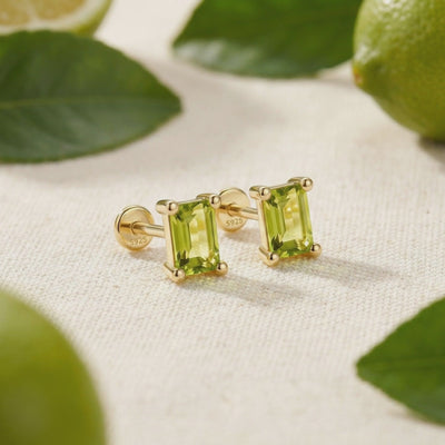 Close-up of emerald cut simulated peridot earrings in 18K gold vermeil showing the S925 hallmark and setting.