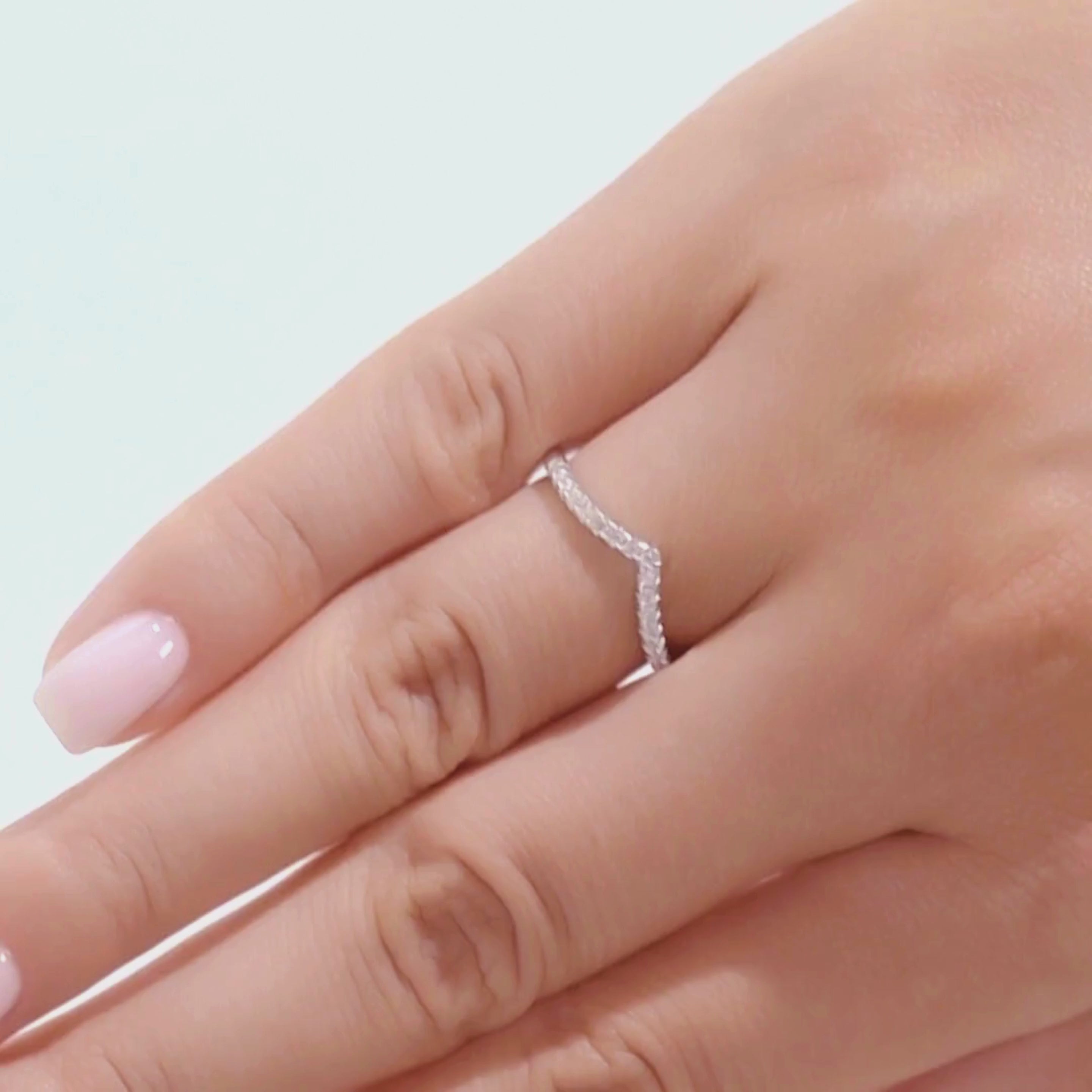 L'Emilia est une pièce magnifique avec son design Zhevron demi-éternité. Fabriquée en argent sterling S925, elle est ornée de pierres de moissanite taille ronde serties en canal, offrant un éclat continu et élégant sous tous les angles.