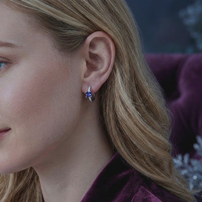 Natural tanzanite is famously rare and often plagued by inclusions that dull its natural fire. These hoop earrings feature precision-engineered Simulated Tanzanite, color-calibrated to match the coveted deep blue-violet with trichroic shifting hues found in museum-grade stones. Each square-cut stone is faceted for maximum light return, ensuring a constant play of color with every movement.