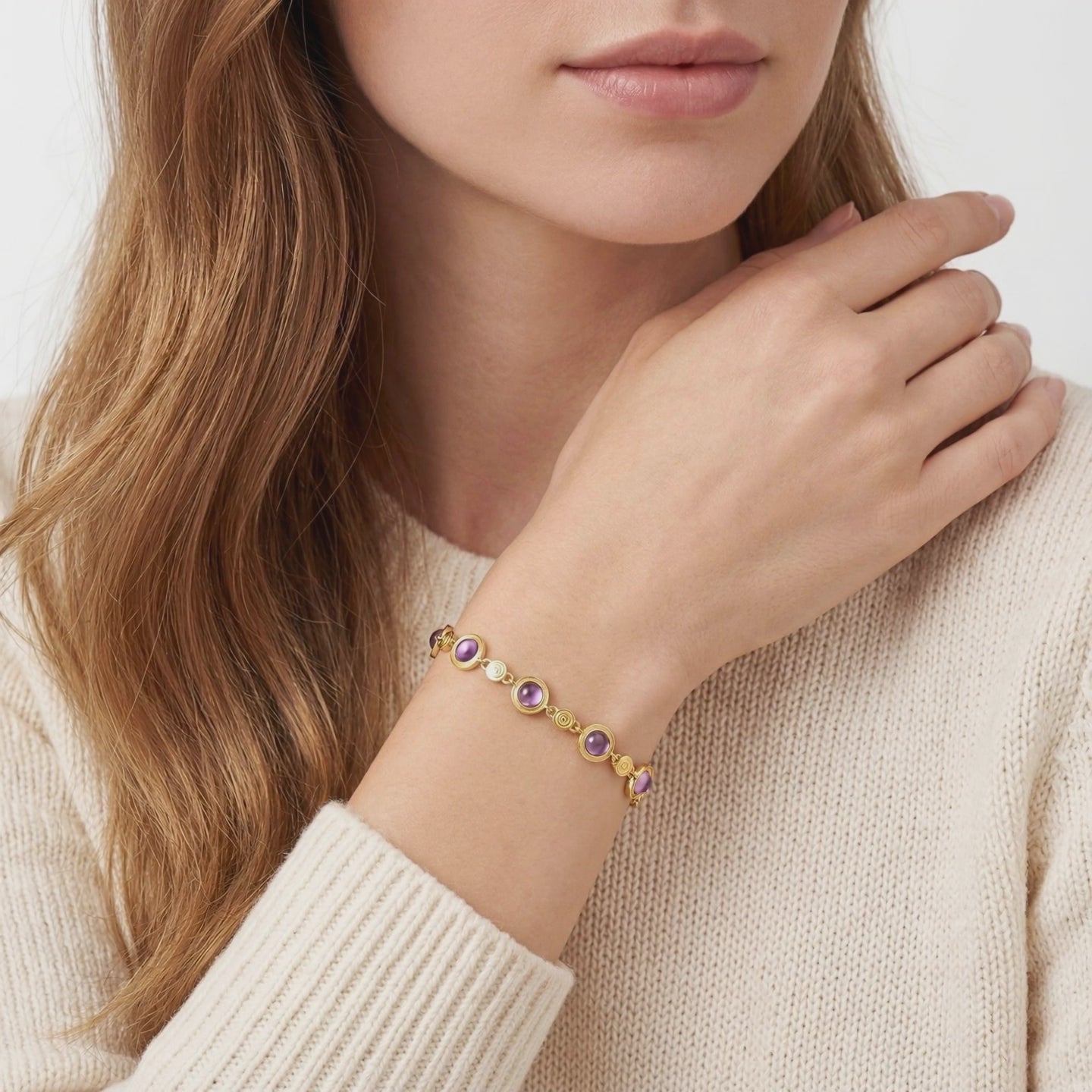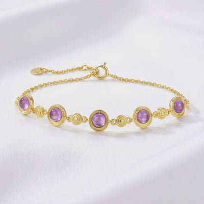 Close-up of round cut simulated amethyst stones and decorative gold vermeil links on the Evangeline bracelet.
