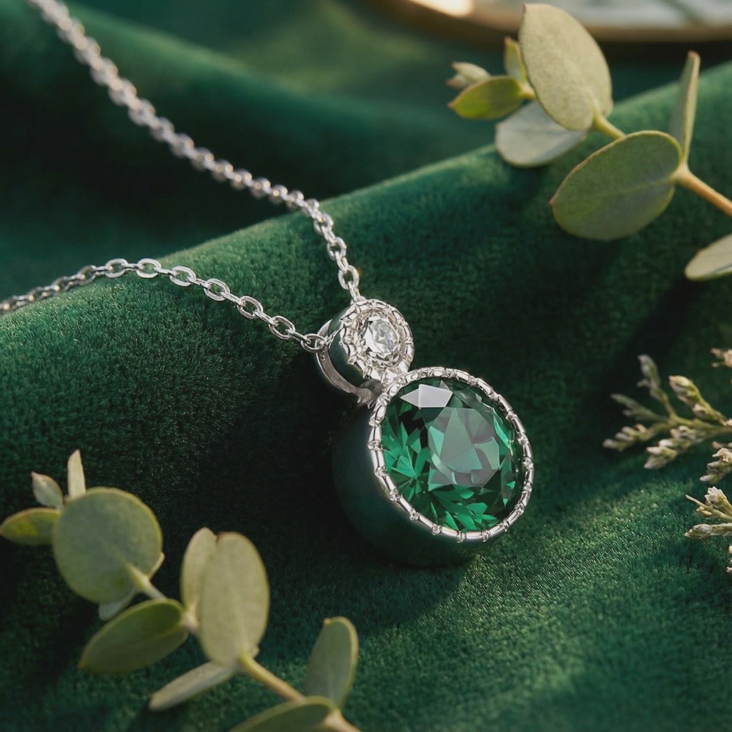 Close-up of a round simulated emerald pendant in a sterling silver milgrain setting on green velvet.