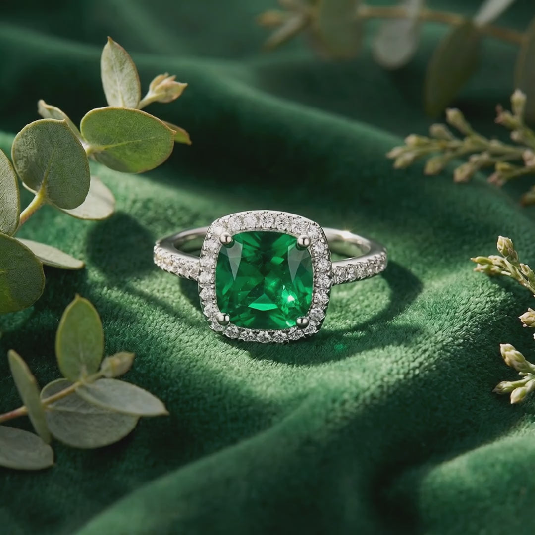- Stone: A5 Grade Cushion-Cut Simulated Emerald (Green)
