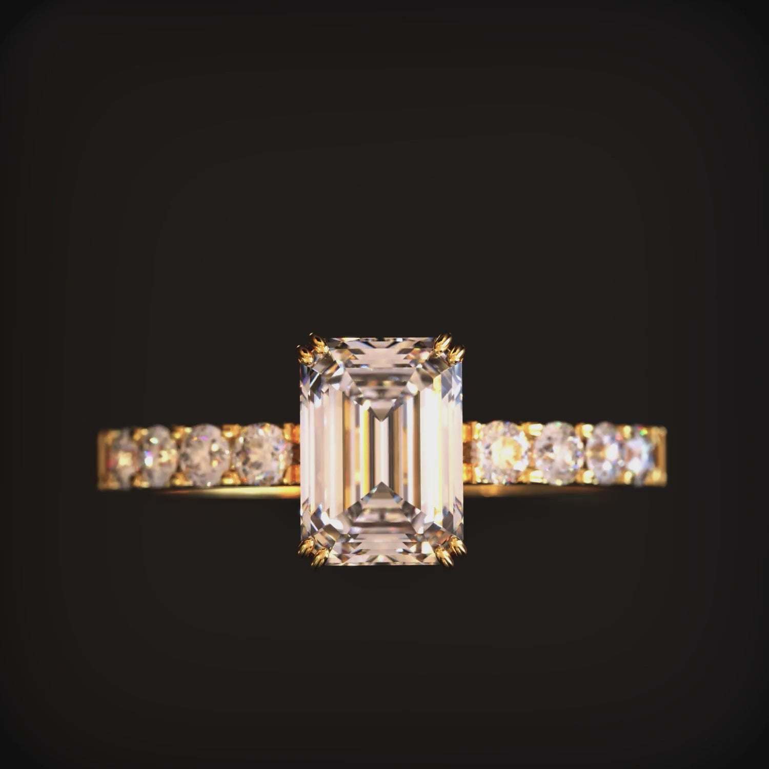 Il y a quelque chose dans la Kiera Belle qui invite à la contemplation. Sa moissanite taille émeraude capte et reflète la lumière d'une manière si fascinante, comme regarder le soleil danser sur l'eau.
