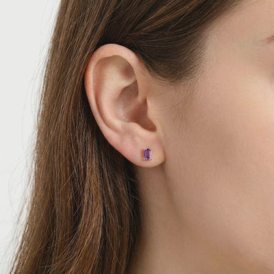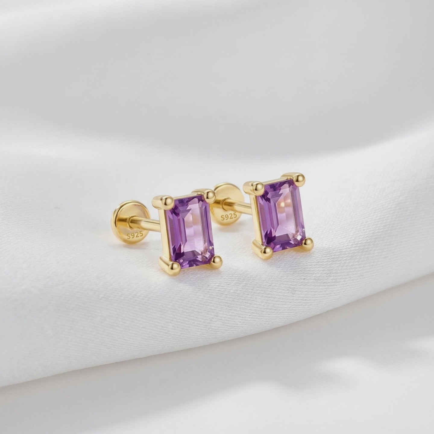 Angled view of 18K gold vermeil emerald cut amethyst studs showing the four-prong setting on white fabric.