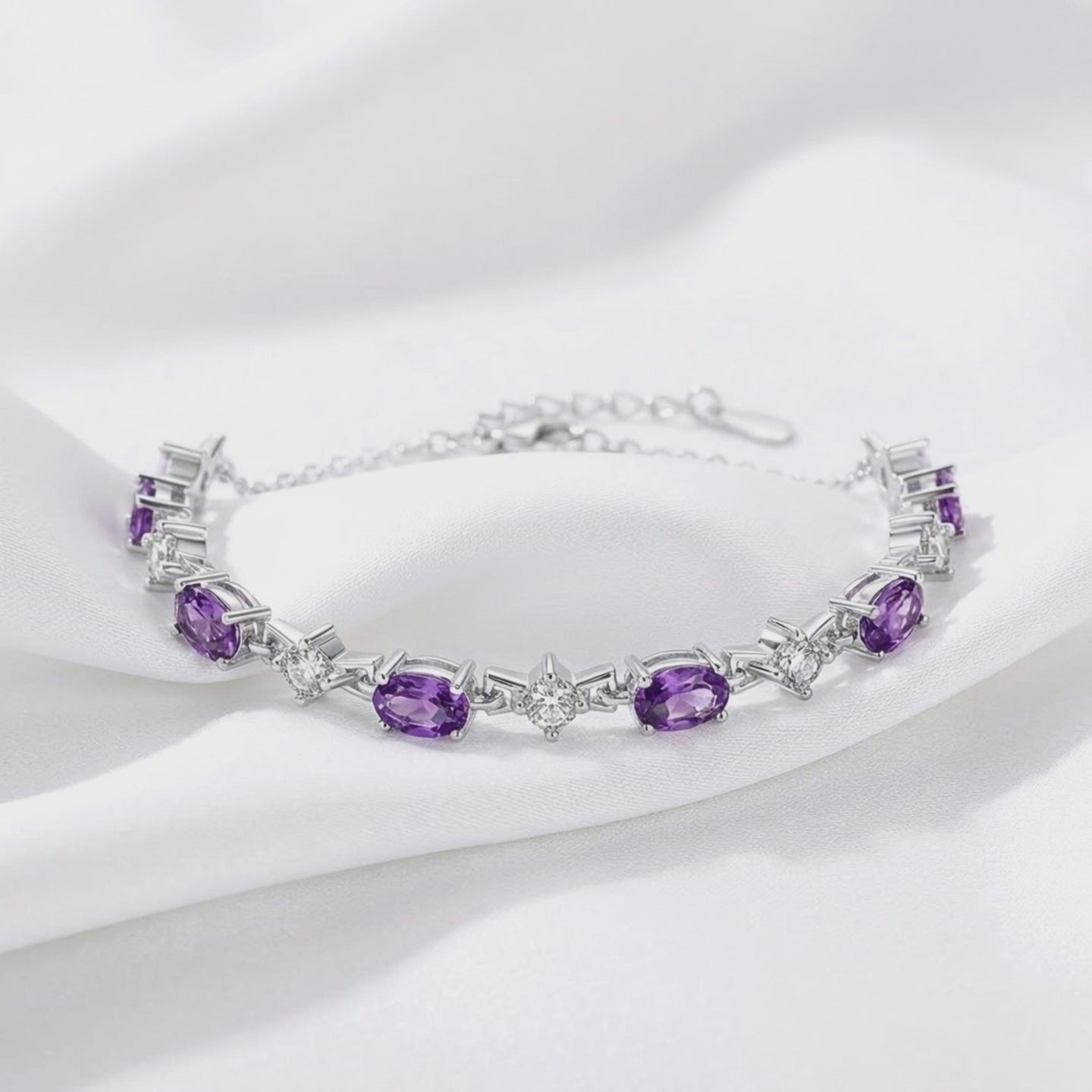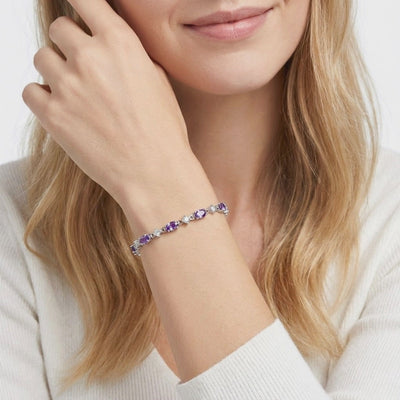 Mined amethysts often suffer from uneven color zoning or cloudy inclusions. The Lucina bracelet is engineered with precision-cut Simulated Amethyst, color-calibrated to achieve the ideal royal purple hue that nature rarely produces with such consistency. Each stone is faceted to maximize visual physics and light return, creating a continuous stream of brilliance around the wrist.