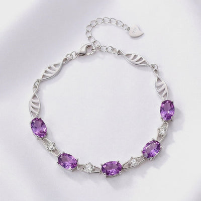 Close-up of oval-cut simulated amethyst and round white stones in a rhodium-finished sterling silver link bracelet.