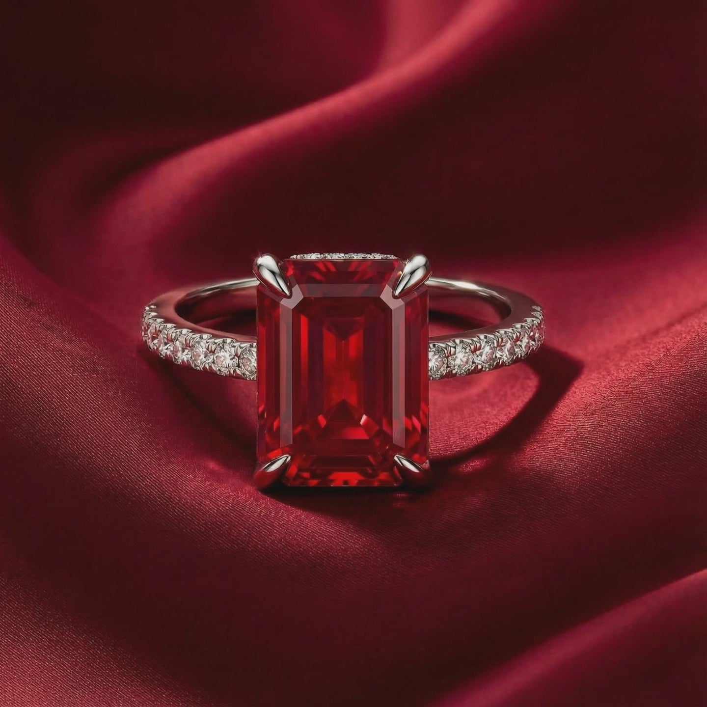 Mined rubies are notoriously inconsistent, often appearing cloudy or brownish. This emerald-cut ring features a Simulated Ruby engineered to match the elite "Pigeon Blood" red benchmark. We've color-calibrated the stone to ensure perfect saturation and VVS-grade clarity that nature rarely delivers on its own.