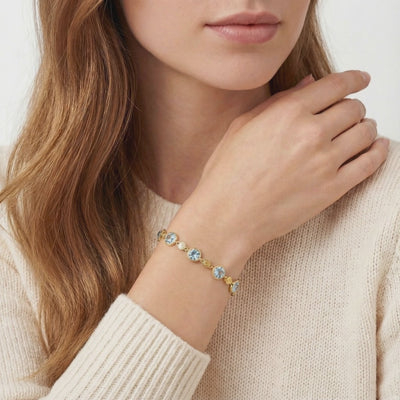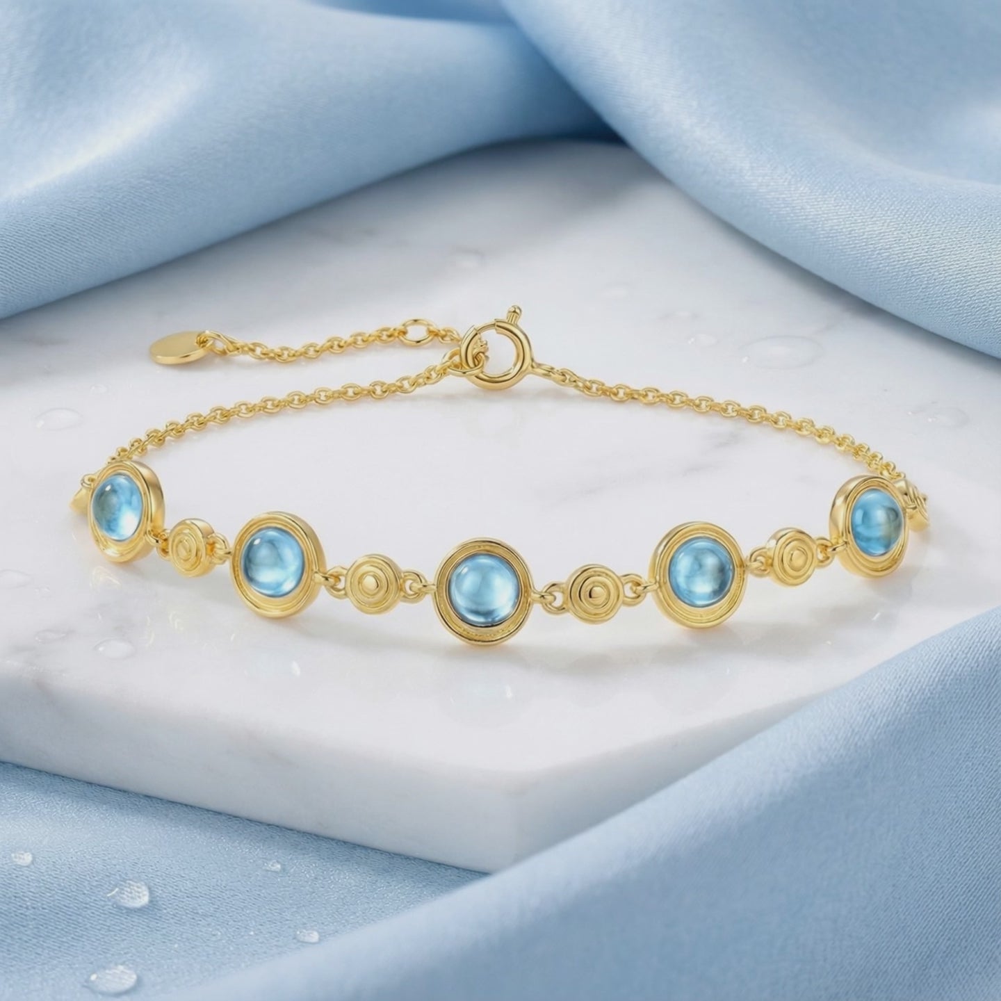Mined aquamarine can often be inconsistent, arriving pale or cloudy. This is Simulated Aquamarine, engineered to match the ideal light blue saturation of museum-grade stones. This bracelet features five precision-cut stations, each color-calibrated to ensure flawless uniformity and optical performance.