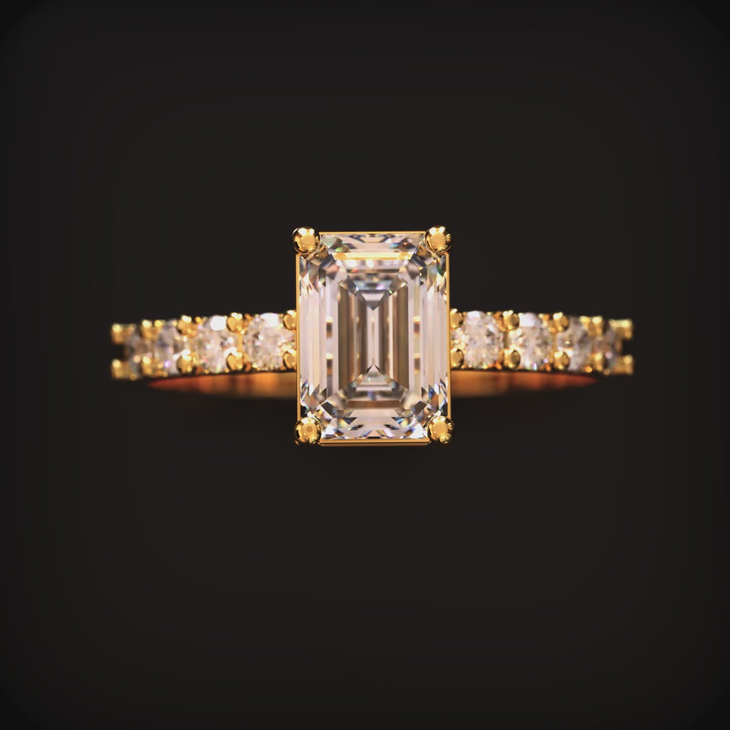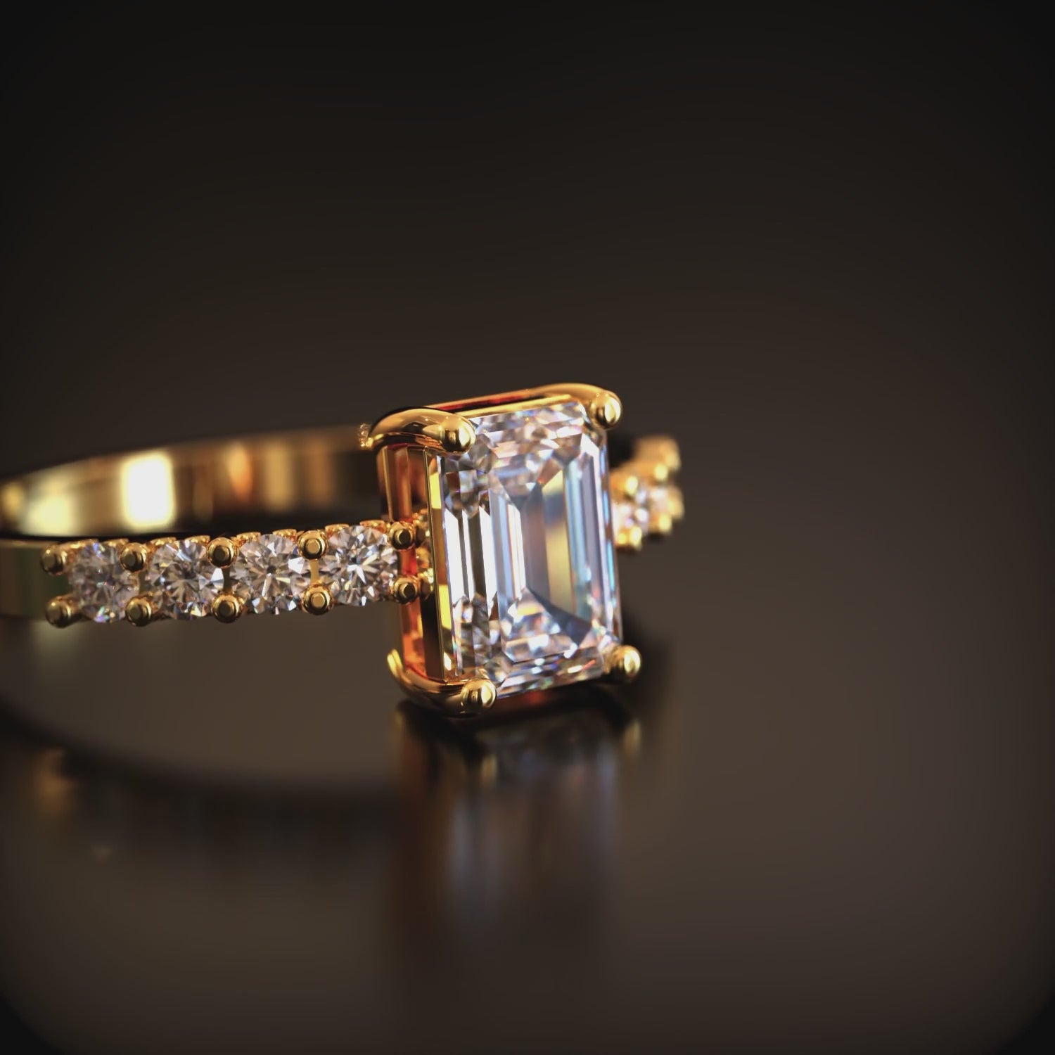 The Nora Joy is the kind of ring that makes you want to slow down and really look at it. At the center, exquisite emerald-cut moissanite commands attention, its clarity and brilliance rivaling even the finest diamonds.