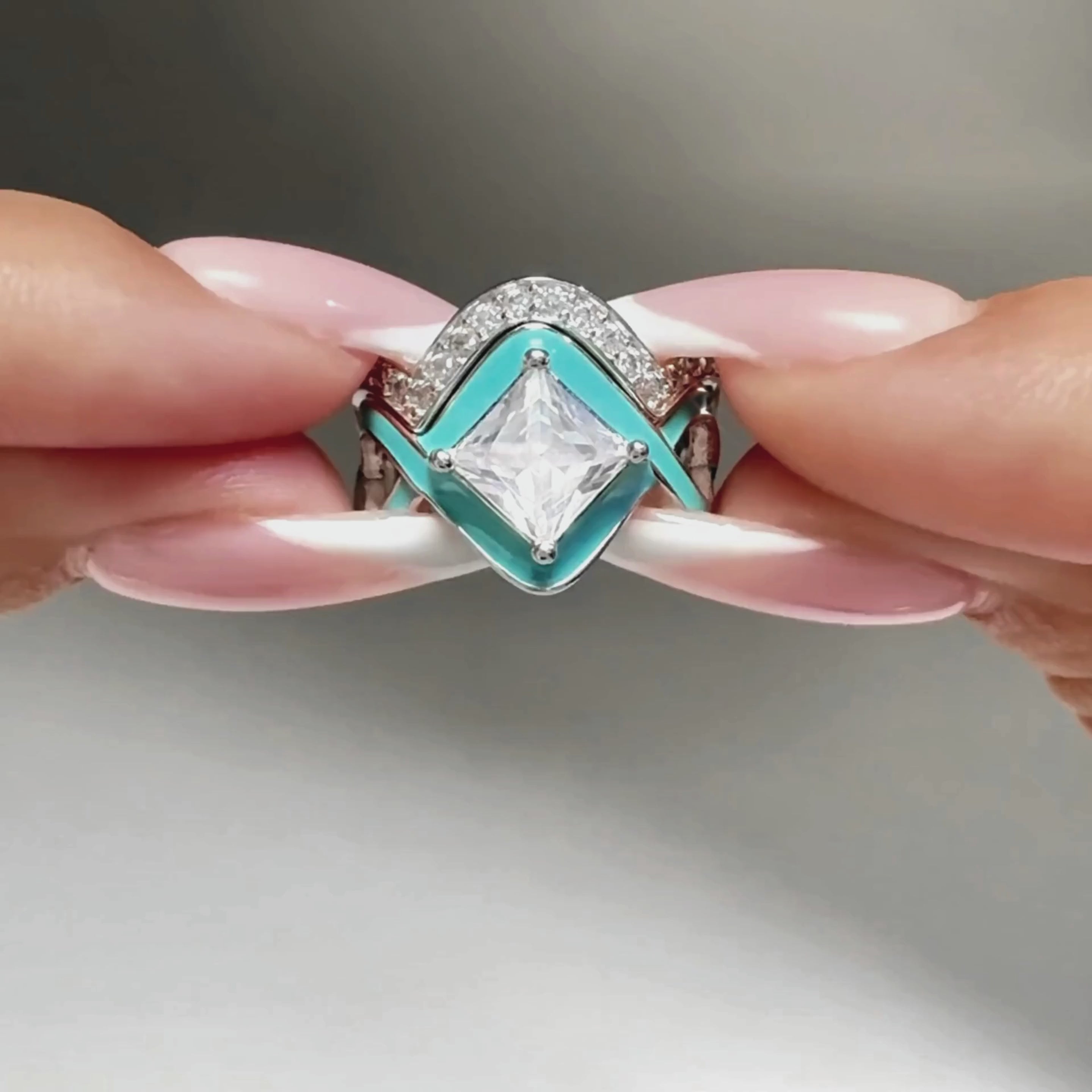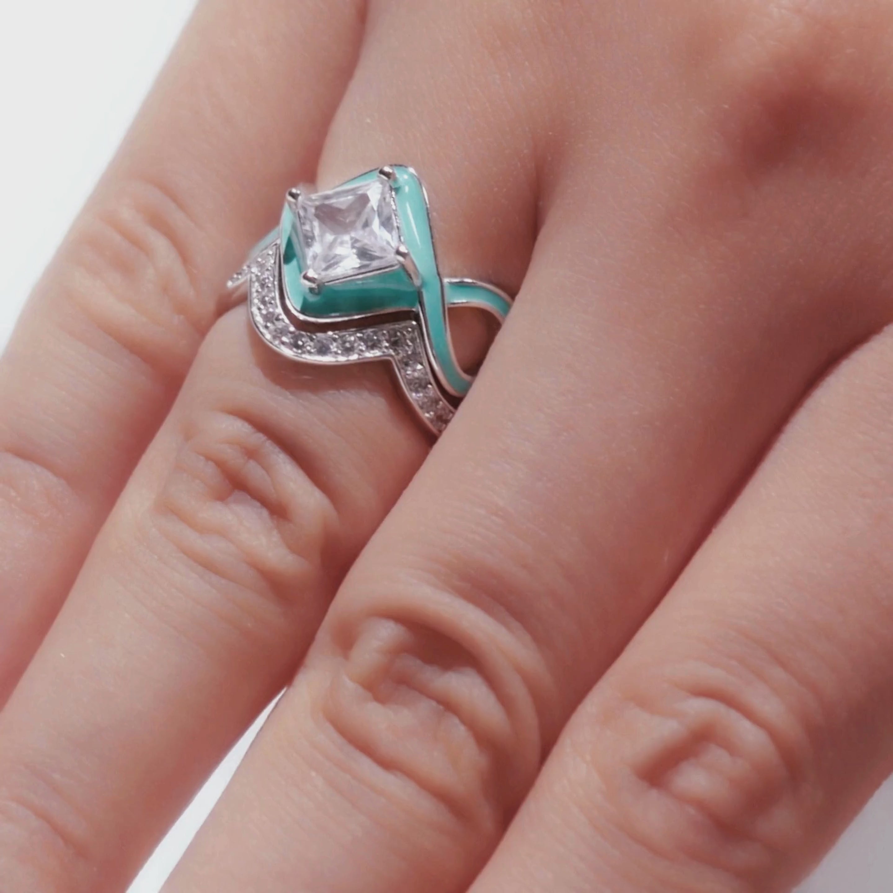 L'Onde Océan capture l'essence de la beauté éternelle avec son design de bague Zhevron complète. Fabriquée en argent sterling S925, cette bague est ornée de diamants simulés taille princesse sertis avec des griffes sécurisées.