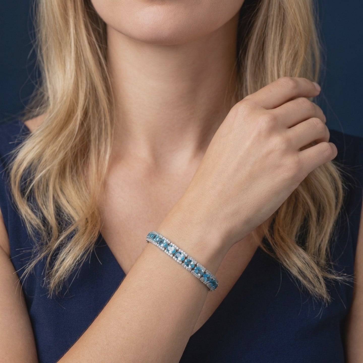 You don't need an occasion to wear extraordinary beauty; you just need the perfect gemstone. Meet your new signature piece. This breathtaking 24-stone tennis bracelet features precision-cut 4x6mm natural topaz centerpieces, expertly faceted in a classic oval cut. Because natural topaz possesses exceptional, eye-clean clarity, our lapidaries designed this continuous arrangement to allow light to travel deeply into each gem, refracting a vivid, oceanic blue hue that commands attention from across the room. Achieved through safe, permanent, industry-standard color enhancement, this vivid saturation will remain brilliant for a lifetime.