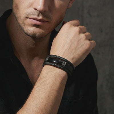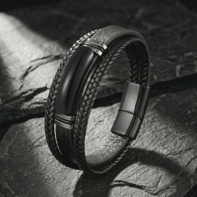 Men's jewelry is broken. Cheap leather frays, and base metals rust in weeks. We built the exact opposite. This braided bracelet integrates premium 15mm black leather with a Swiss Watchmaker Grade 316L stainless steel clasp.