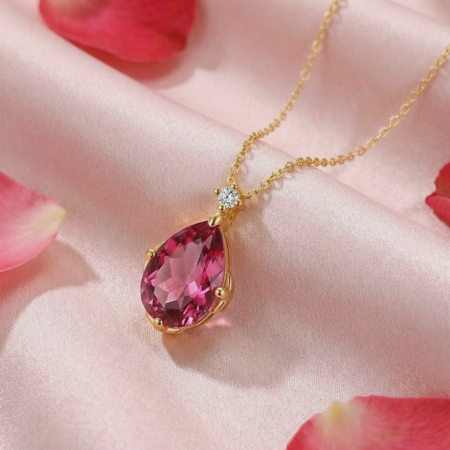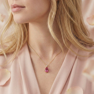 Close-up of the pear-cut simulated pink tourmaline pendant and 18K gold vermeil setting with rose petals.