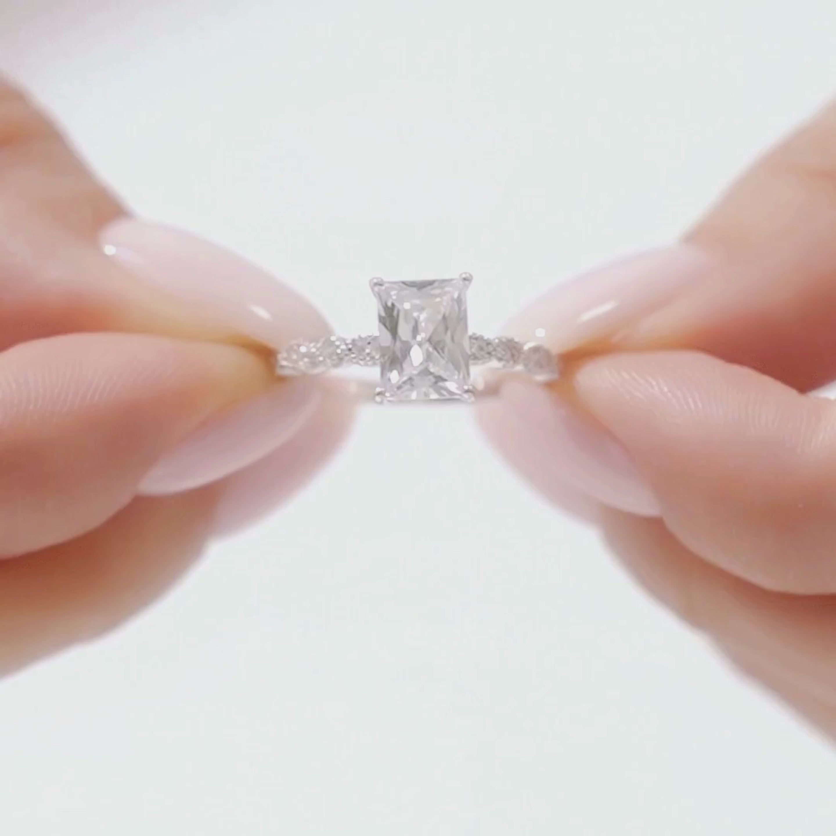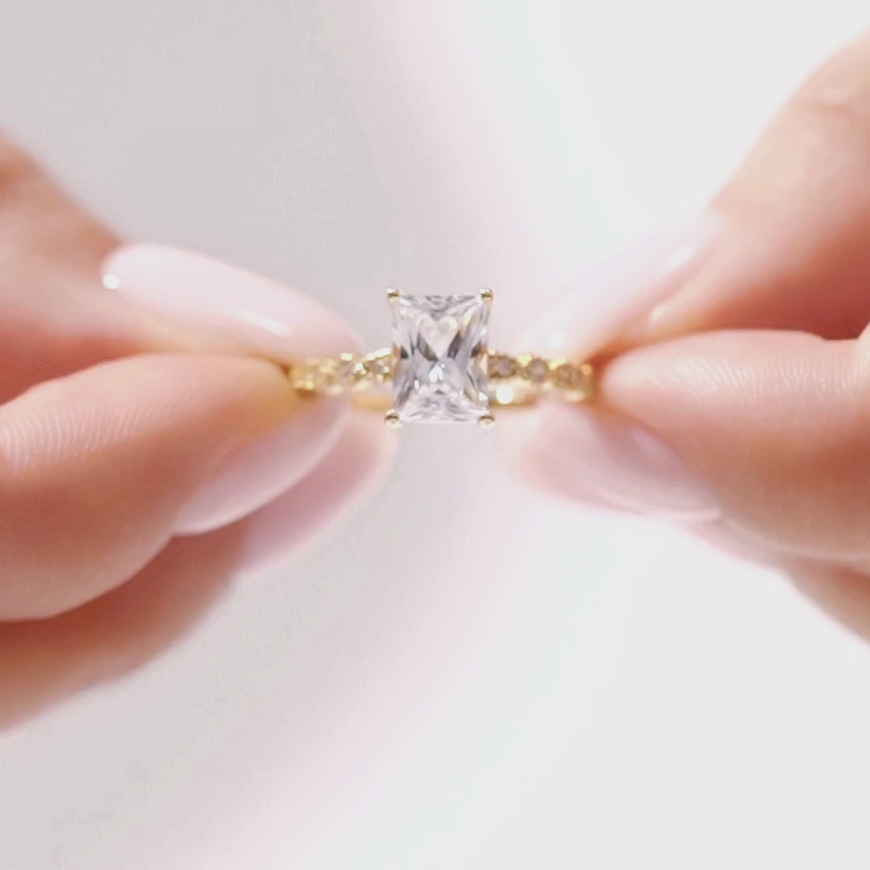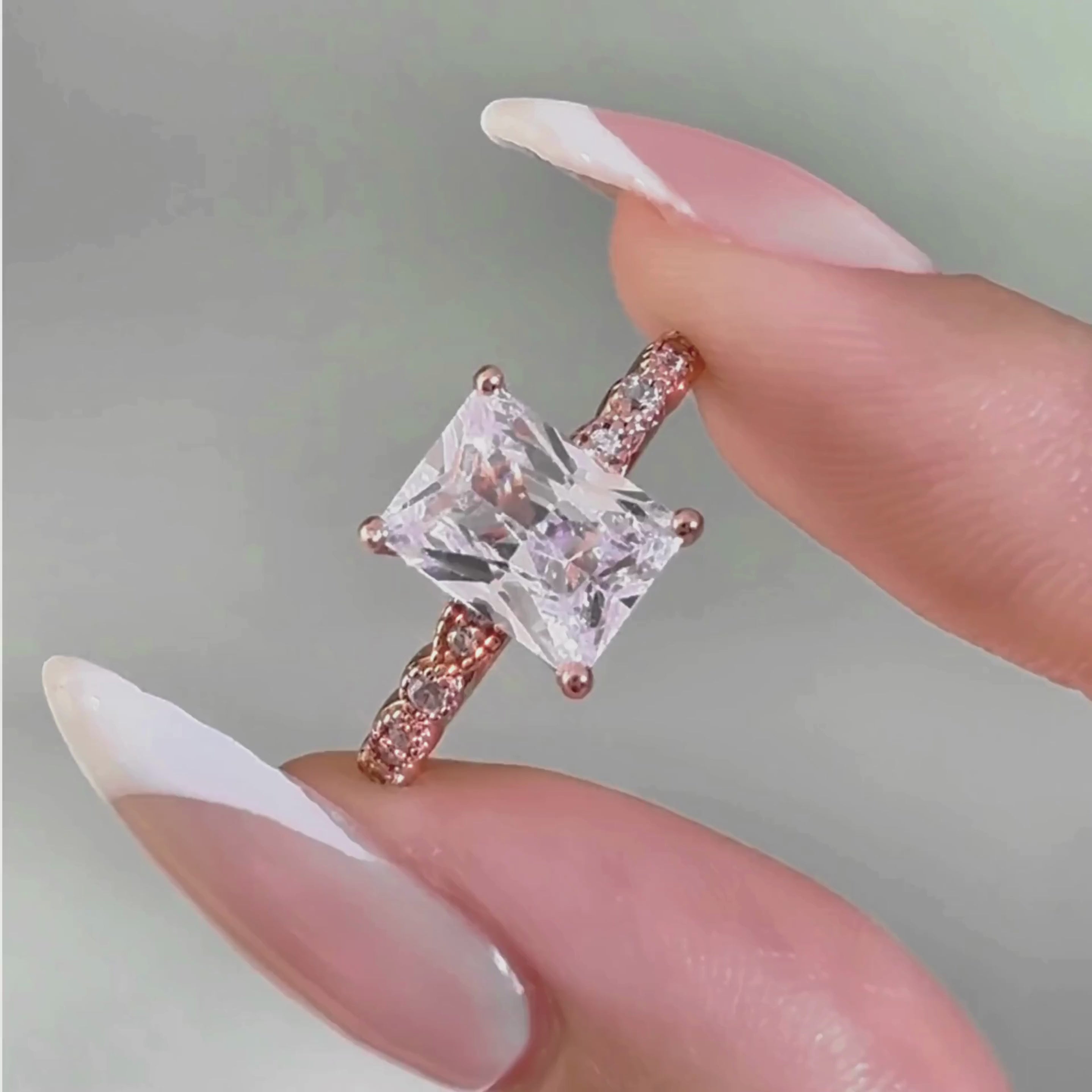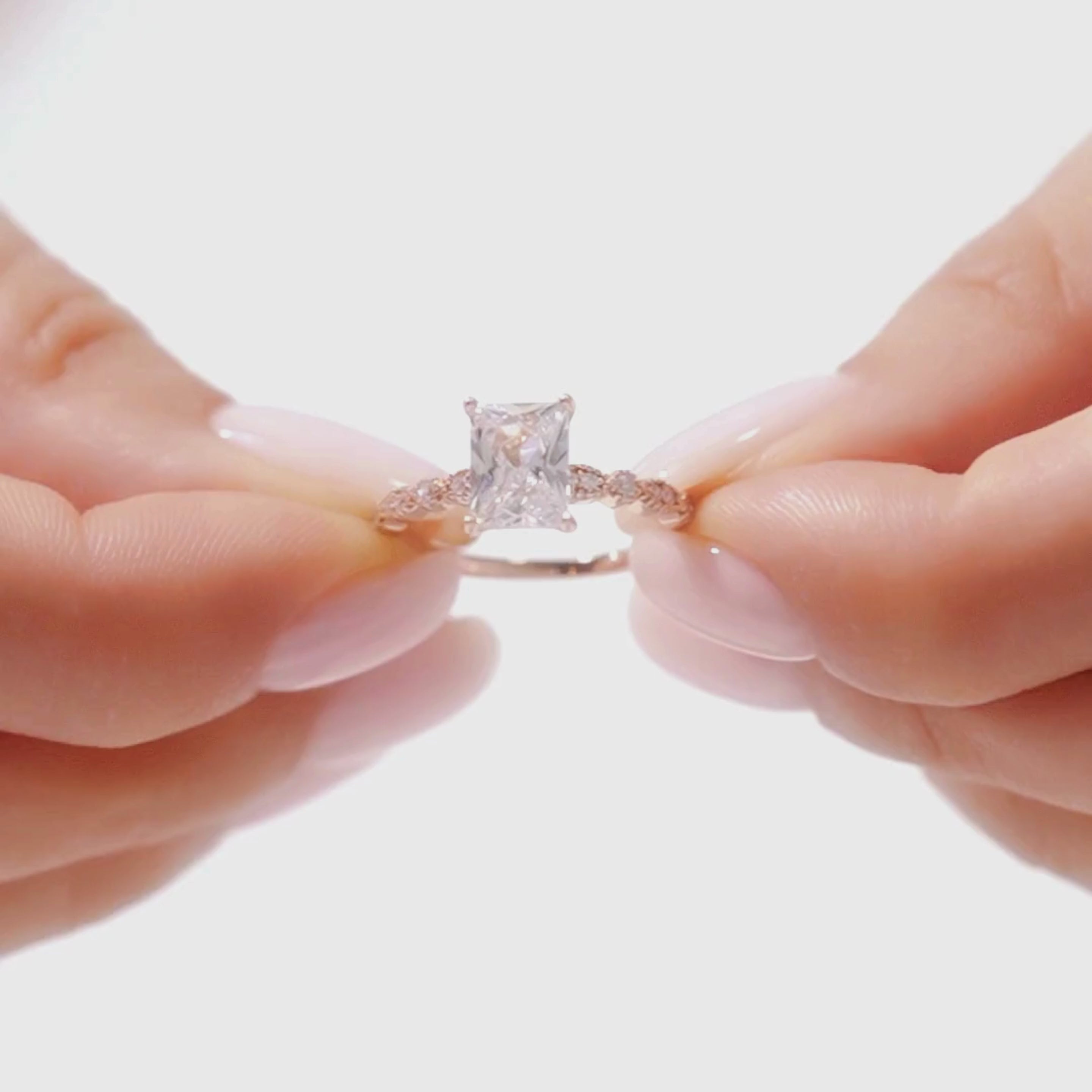 La Solace-Rose allie élégance et une touche de romantisme. Cette bague solitaire classique demi-éternité est fabriquée en argent sterling S925 avec un placage en or rose 18 carats, et est ornée d'un diamant de laboratoire taille émeraude serti en griffes et en lunette.