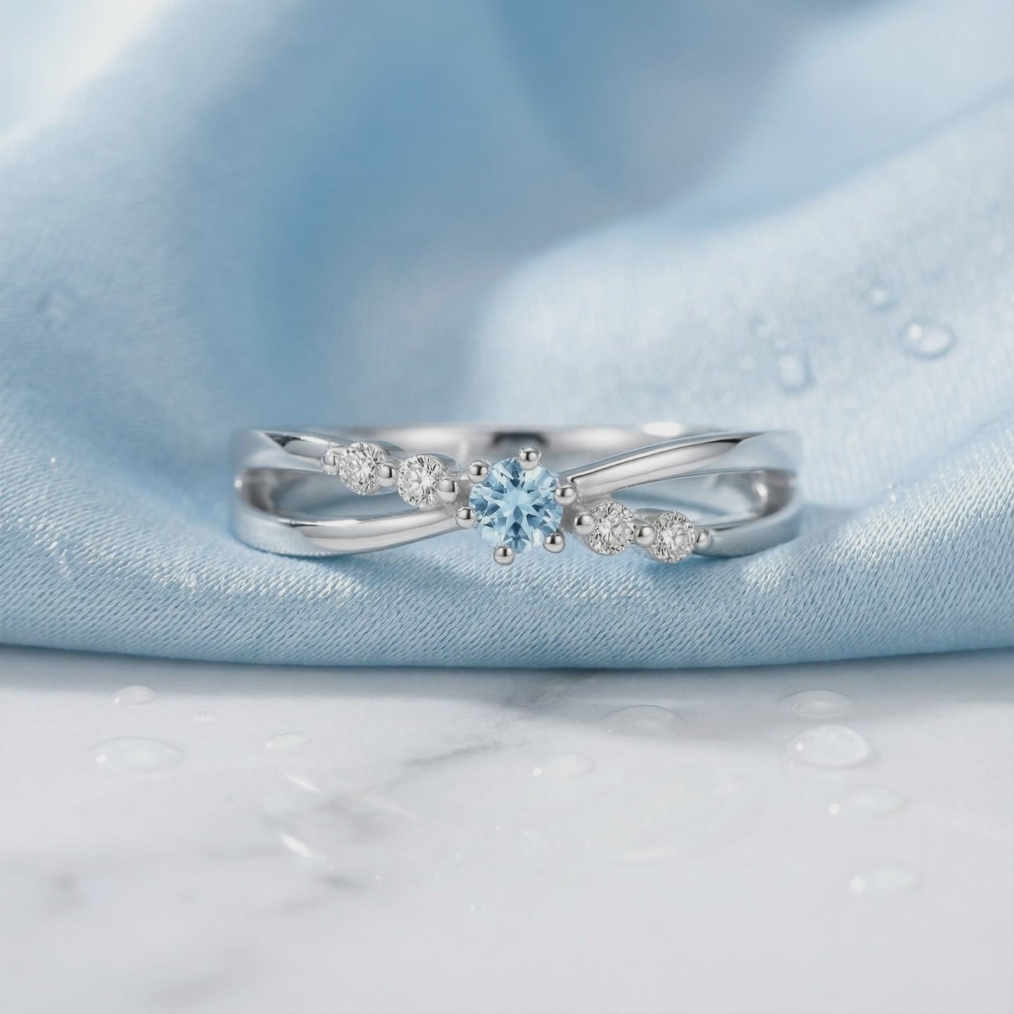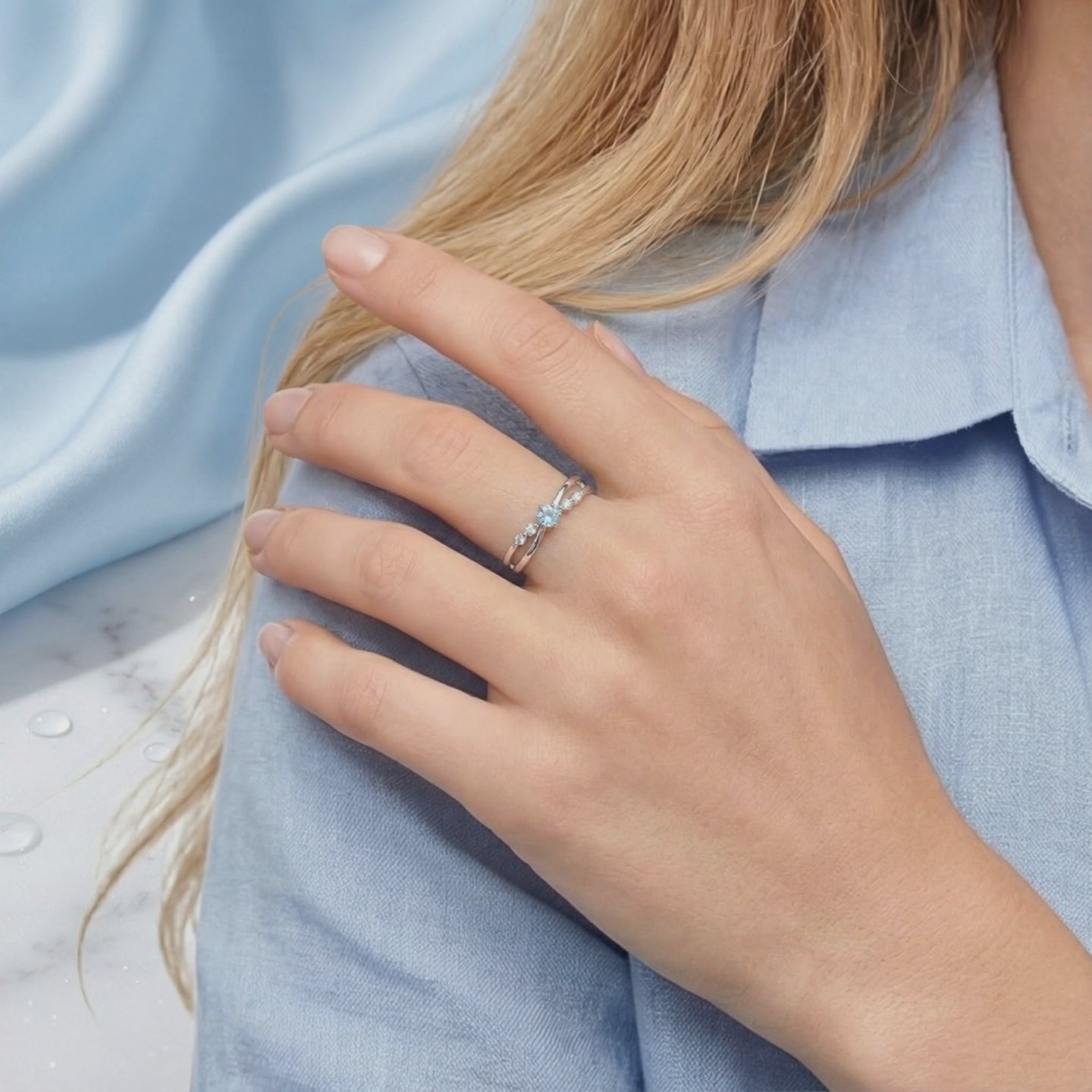 Angled view of the Sylphide silver ring featuring a round light blue simulated aquamarine and accent stones.