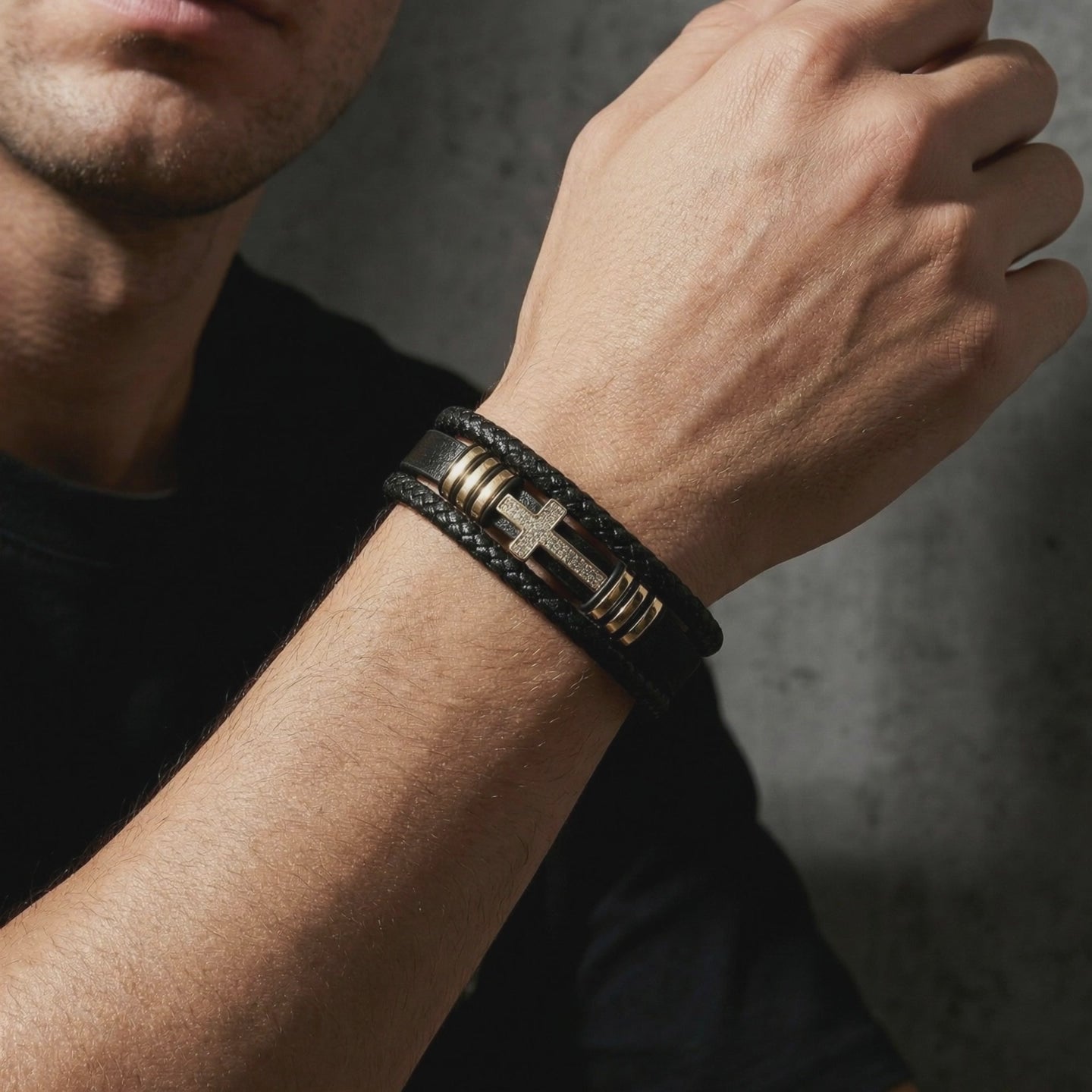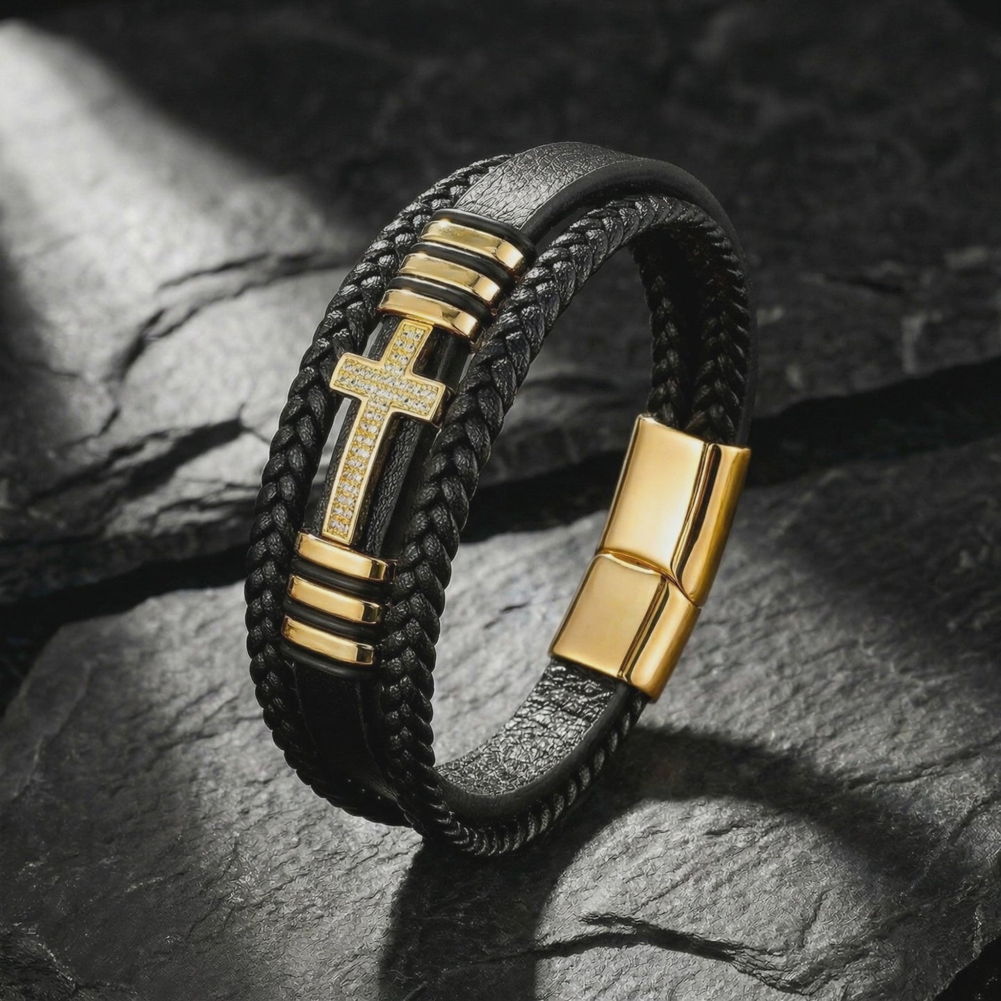 Designed with a sleek, 15mm multi-layered black leather rope and a secure magnetic clasp, this bracelet is built to outlast trends and decades of daily wear. The striking gold-finished cross adds a subtle but powerful touch to your stack. Shower in it. Sweat in it. Never think twice about taking it off.