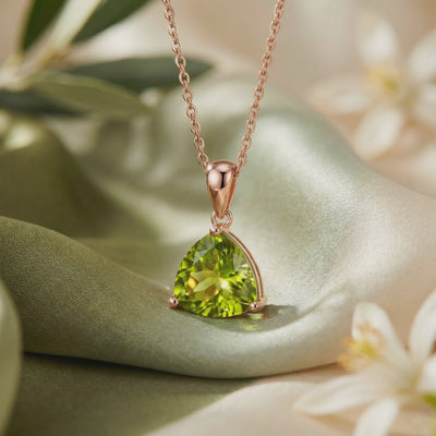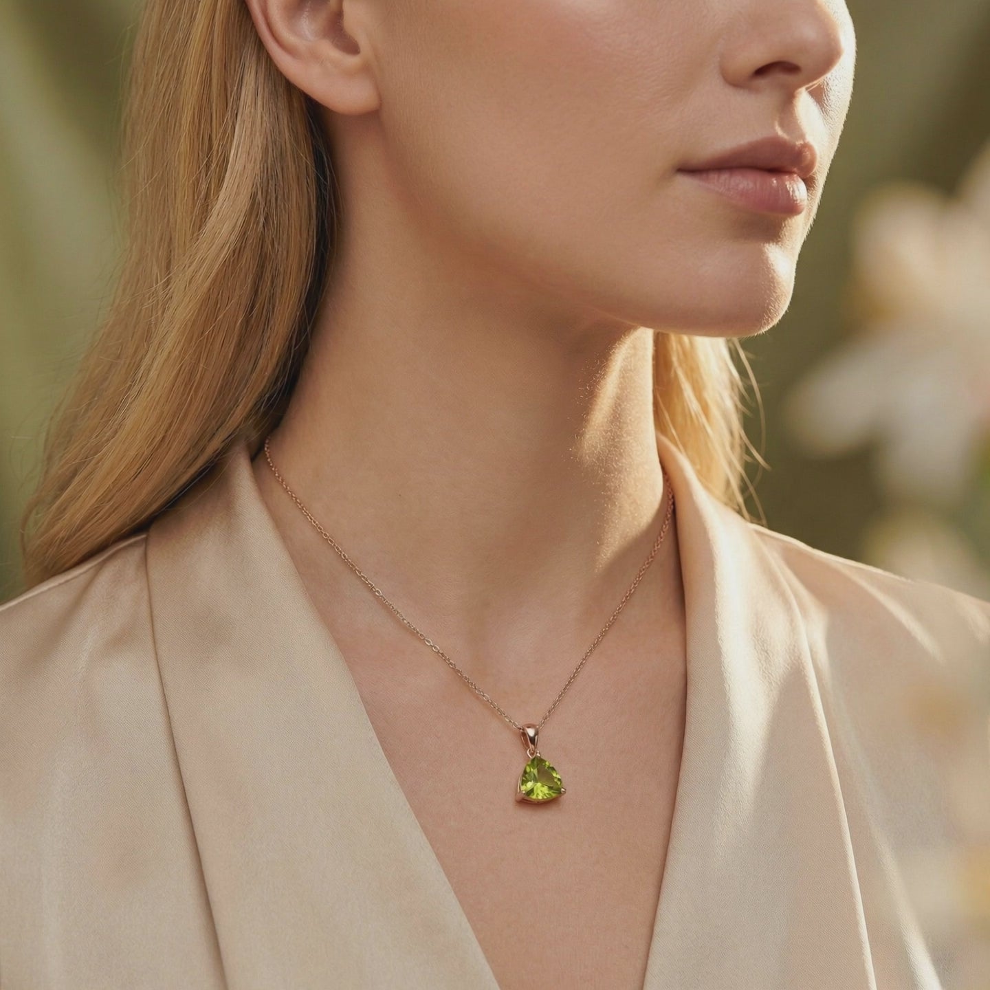 Sharp, modern, and unapologetically vibrant. The Trillia Pendant captures the essence of the "Evening Emerald" in a striking 7mm Triangle Cut Natural Peridot. This unique geometric shape maximizes the stone's electric lime-green fire, ensuring it catches the light—and the room's attention—from every angle. It is a bold departure from traditional cuts, designed for the woman who defines her own path.