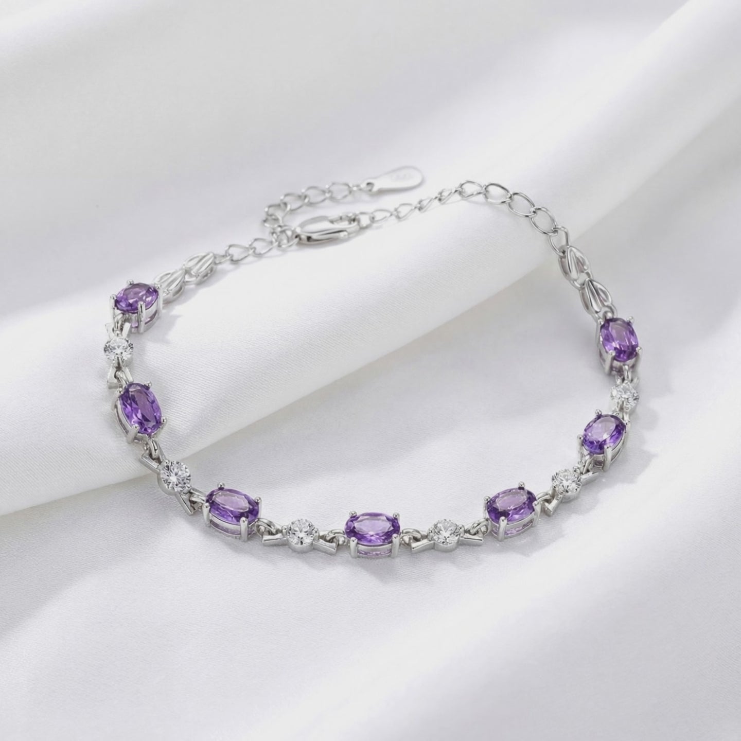 Macro view of the Valeriane sterling silver bracelet showing oval-cut simulated amethyst and round clear stones.