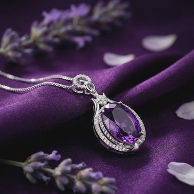 Radiate the regal presence of the ages with this breathtaking pendant. Centered around a massive 13-carat Natural Amethyst, this pendant captures the deep, saturated violet hues that have captivated royalty for centuries. The precision Oval Cut (13x17mm) maximizes the stone's optical depth, allowing it to dance with light and eliminate windowing for a display of pure geological wonder.