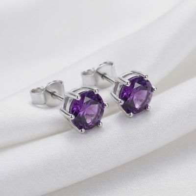 Macro shot of round cut simulated amethyst stud earrings in a 6-prong sterling silver setting.