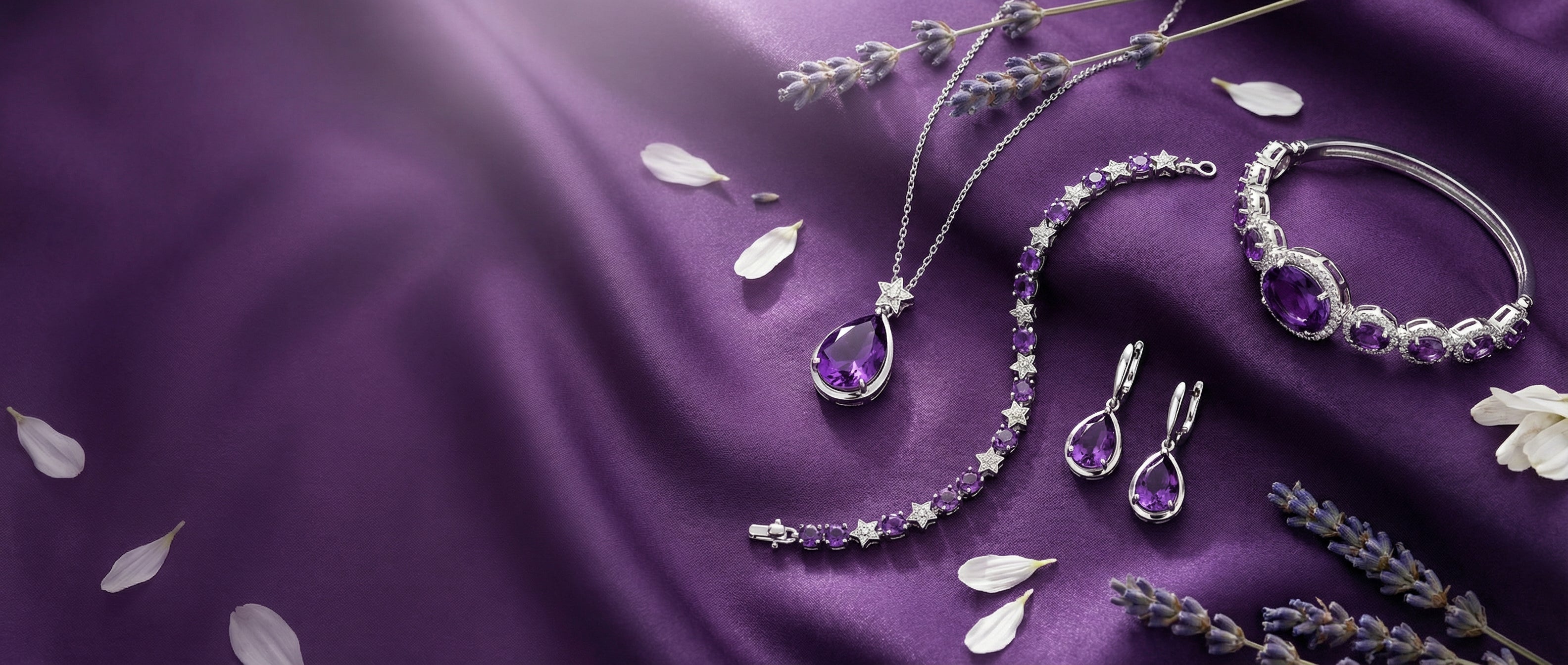 In de aanbiedingS925 sterling silver station bracelet with square cut amethysts on purple silk with lavender sprigs.Square cut amethyst and S925 sterling silver bracelet worn on a woman's wrist against a purple background.