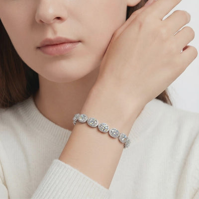 Each oval-cut 5A Zirconia stone is precision-set in a protective halo of brilliant accents to maximize light return. Engineered for the grind of daily life, the mounting is forged from Solid 925 Sterling Silver and finished with a Platinum-family Rhodium layer to resist tarnish and maintain a mirror-like shine. This tennis bracelet features a reinforced clasp and an adjustable 19+4cm chain to ensure a secure and comfortable fit on any wrist.