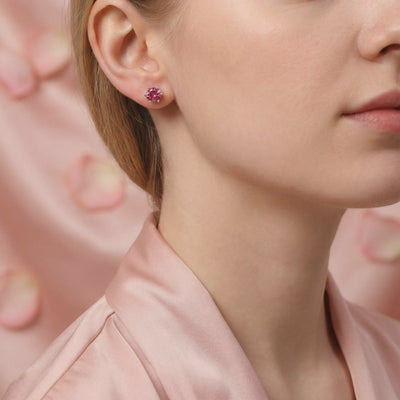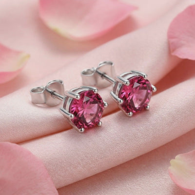 Close-up of round cut simulated pink tourmaline stud earrings in a sterling silver prong setting.