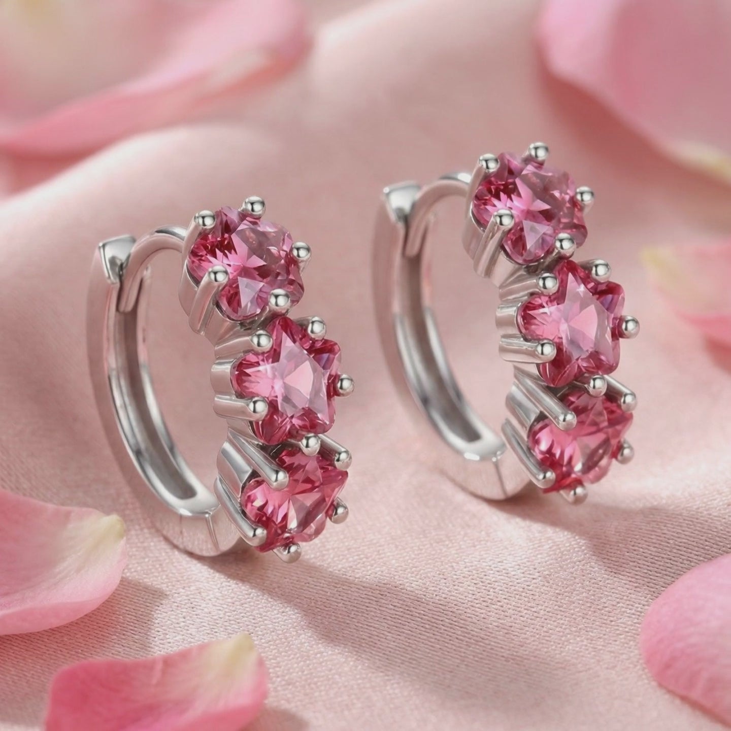 Front view of silver star huggie earrings with three star-cut pink tourmaline stones on a pink fabric background.