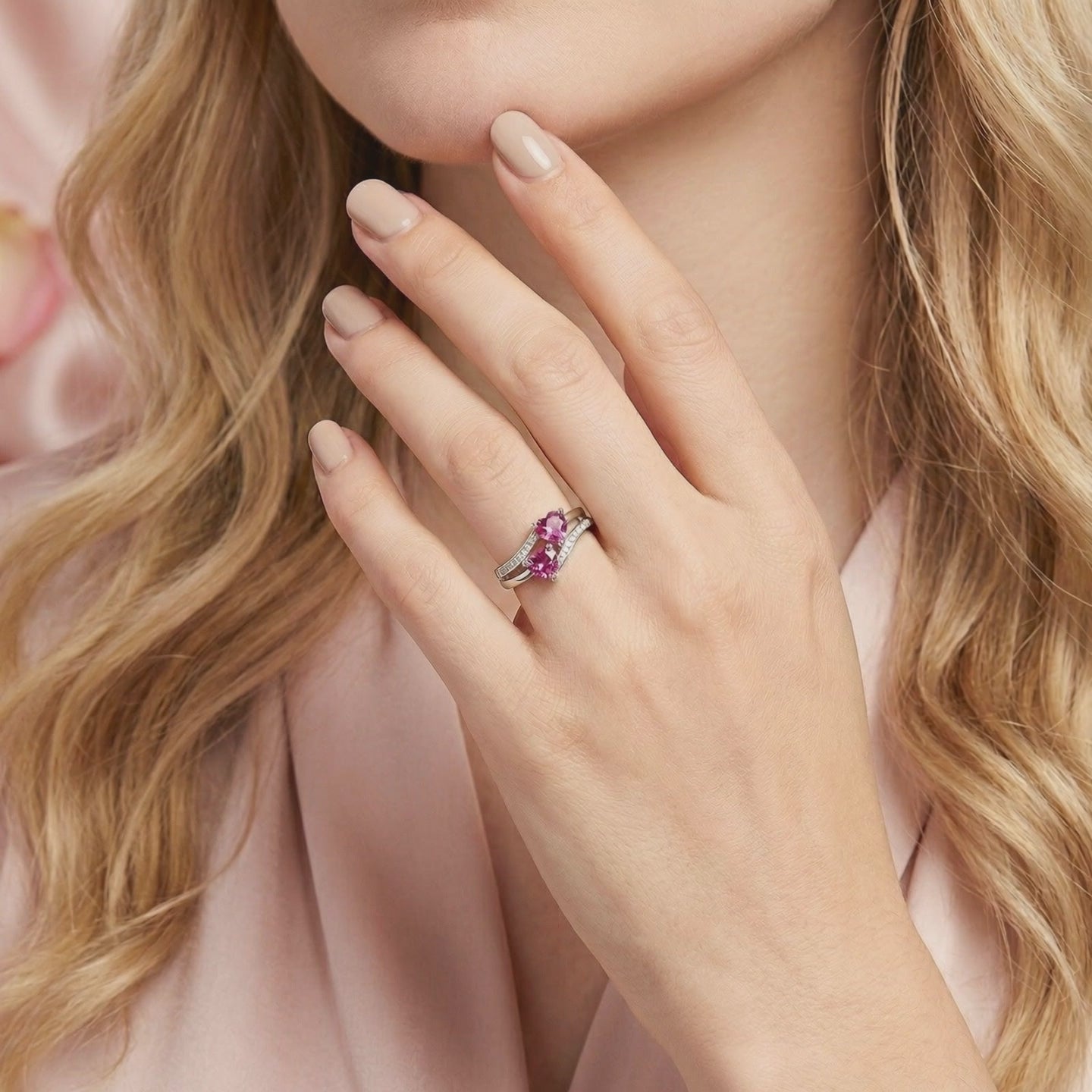 Mined pink tourmaline is rarely consistent in color or clarity, often arriving with visible inclusions or dull saturation. This bypass ring is engineered with high-performance simulated stones, color-calibrated to achieve the ideal raspberry brilliance with exceptional transparency. Precision-cut from A5 grade material, it delivers the exact visual profile of a museum-grade gemstone without the scarcity tax.