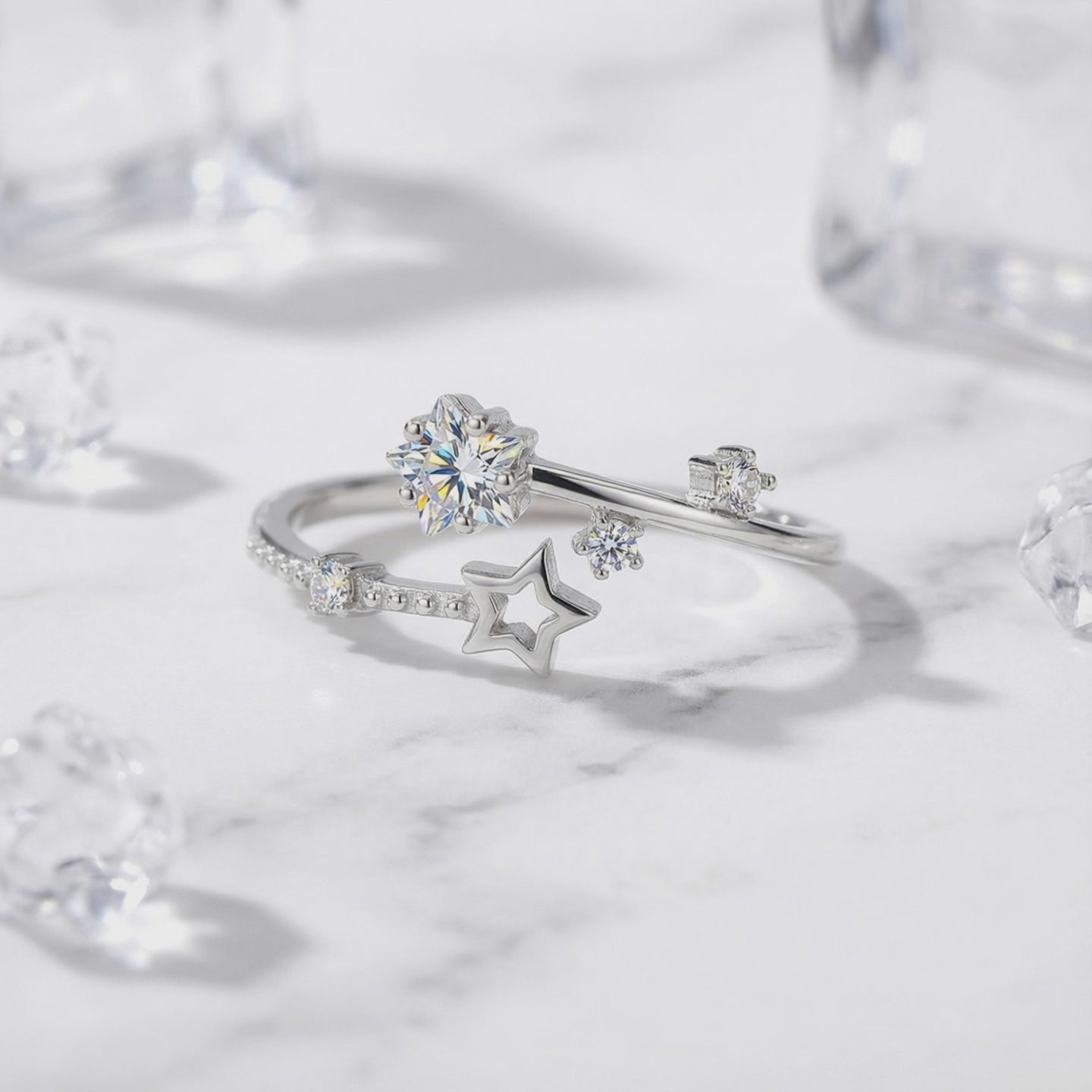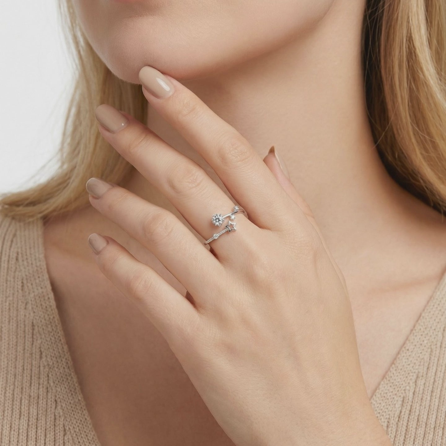 The bypass design is engineered for both aesthetics and daily durability. Unlike high-profile settings that catch on sweaters, this open-ended bypass ring sits low to the finger, making it ideal for daily work and active wear. The star-inspired mountings protect the stones while maximizing light entry for consistent brilliance from every angle.