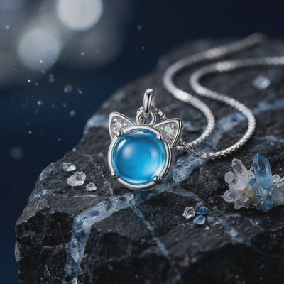 Model wearing the Cerulean Swiss Blue topaz cat pendant necklace in white gold.