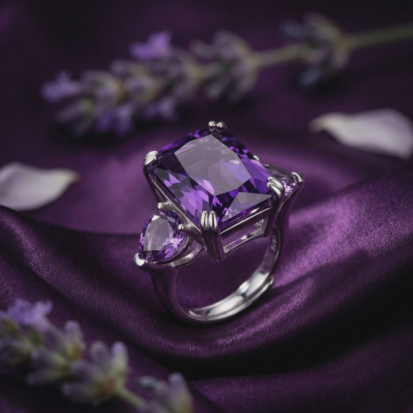 Crafted in solid S925 Sterling Silver, the setting provides a cool, lustrous frame that perfectly complements the intense saturation of the center stone. Two sparkling simulated diamond accents flank the amethyst, adding a touch of brilliance that draws the eye inward. Designed with an adjustable band (fits US sizes 5-10), this piece ensures a perfect, comfortable fit for any finger, making it an ideal gift or a versatile addition to your own collection.