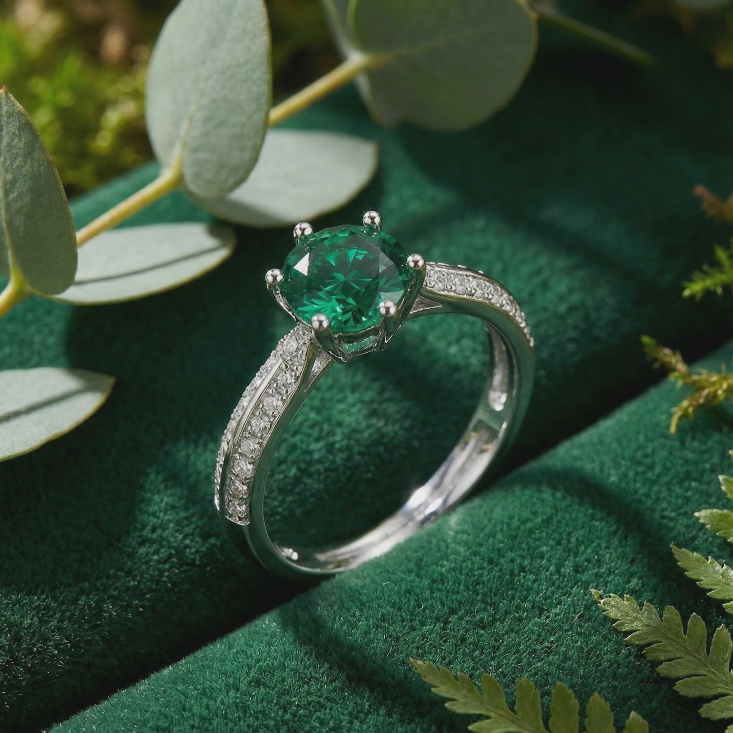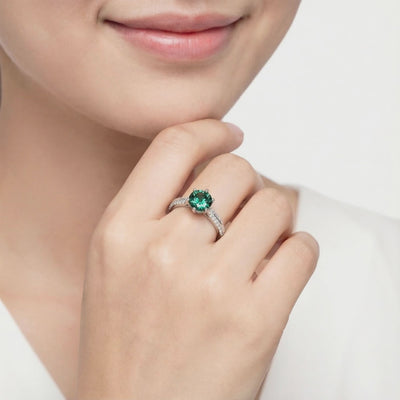 Mined emeralds are notoriously flawed, often filled with internal fractures and clouds. This ring features a Simulated Emerald, engineered to capture the ideal "Forest Green" saturation and VVS clarity that nature rarely delivers. Every stone is color-calibrated to match museum-grade benchmarks, ensuring a deep, consistent glow from every angle.