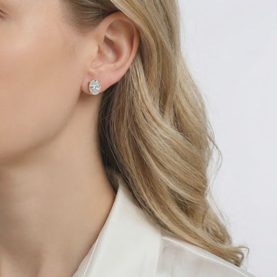 These earrings are engineered for daily durability. We used Solid 925 Sterling Silver as the core material, finished with a thick layer of 18K Gold Vermeil for armor-like resistance to tarnish and daily wear. The four-prong setting is low-profile to prevent snagging on knitwear, while the double-notched posts ensure your investment stays secure through your commute, your workout, and your evening.