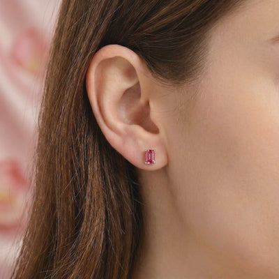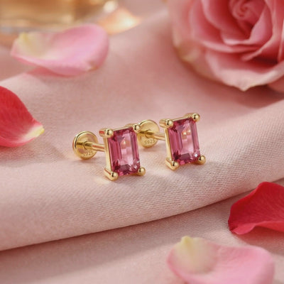 Mined pink tourmaline is rarely found with this level of clarity and saturation. We engineered a solution. These baguette-cut earrings feature Simulated Pink Tourmaline, color-calibrated to achieve a vivid pink with warm raspberry brilliance and exceptional clarity. Each stone is precision-faceted from A5-grade material to ensure maximum light return without the cracks or inclusions found in nature.