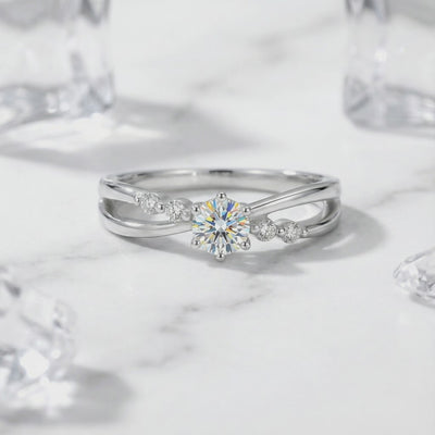 Angled close-up of the Iseltra S925 sterling silver bypass ring showing the round-cut simulated diamond.