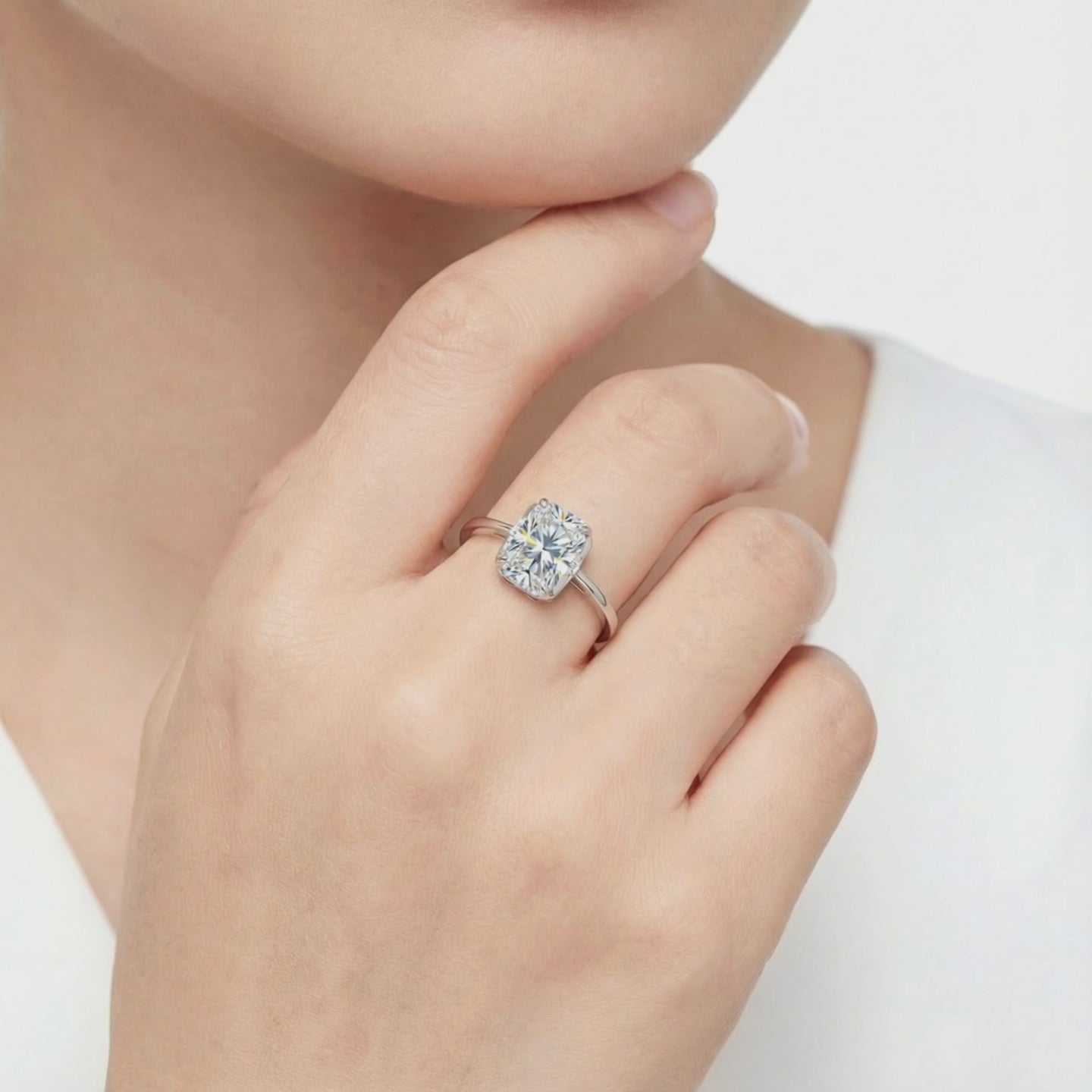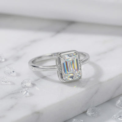- Stone: Emerald-Cut VVS Moissanite (Higher refractive index than diamond).